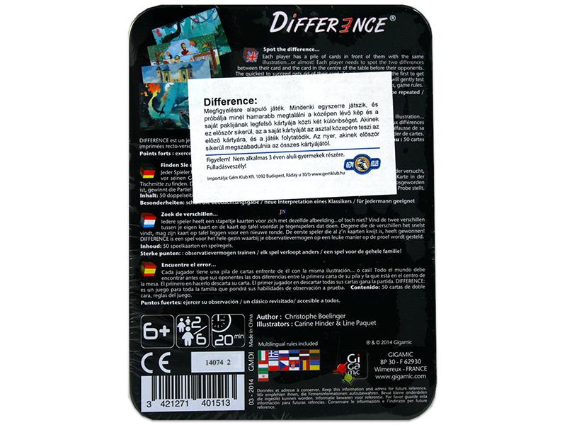 andnbsp; A Difference egy megfigyelésre alapuló játék. Mindenki egyszerre játszik, és próbálja minél hamarabb megtalálni a középen lévő kép és a saját paklijának legfelső kártyája közti két különbséget. Akinek ez először sikerül, az a saját kártyáját az asztal közepére teszi az előző kártyára, és a játék folytatódik. Az nyer, akinek először sikerül megszabadulnia az összes kártyájától.