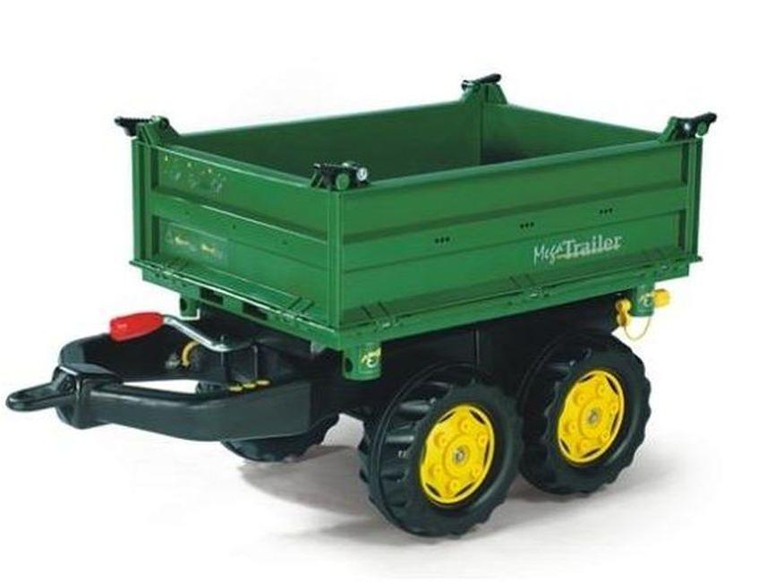 Rolly Toys Mega Trailer John Deere - három oldalra billenő műanyag utánfutó, zöld színű: ideális kiegészítő már meglévő Rolly Toys pedállal hajtható gyermek járművekhez. Méret: 88 x 45 x 47 cm. Súlya: 6 kg. Nagy méret, extrém stabil és terhelhető. A dupla (tandem) kerék tengelypár is ezt biztosítja. 3 felé képes billenni, de egyszerre csak 1 irányba, ez 2 biztonsági csapszegeccsel van biztosítva.