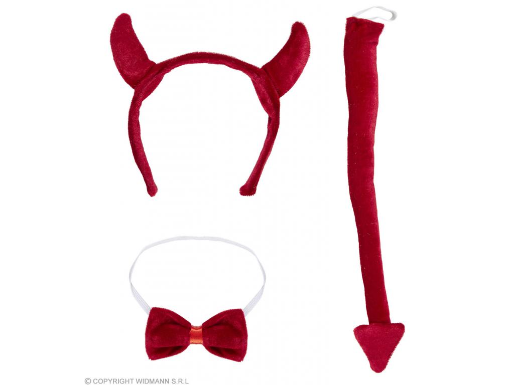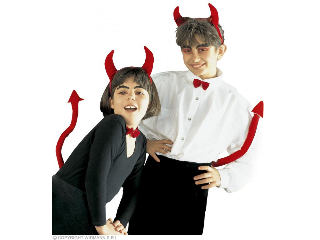 Jelmezkiegészítő gyerekeknek, 3 részes: gumiszalagos csokornyakkendő, piros bársony farok és hajpántra rögzített szarv. Egyéb kiegészítőt nem tartalmaz.