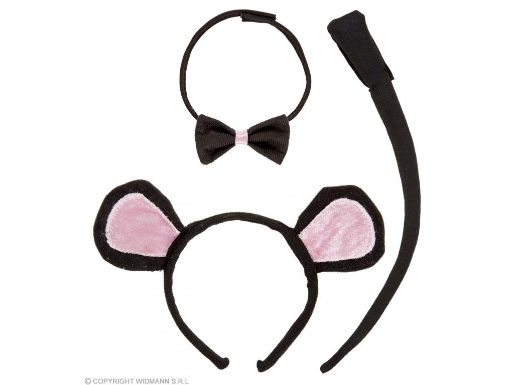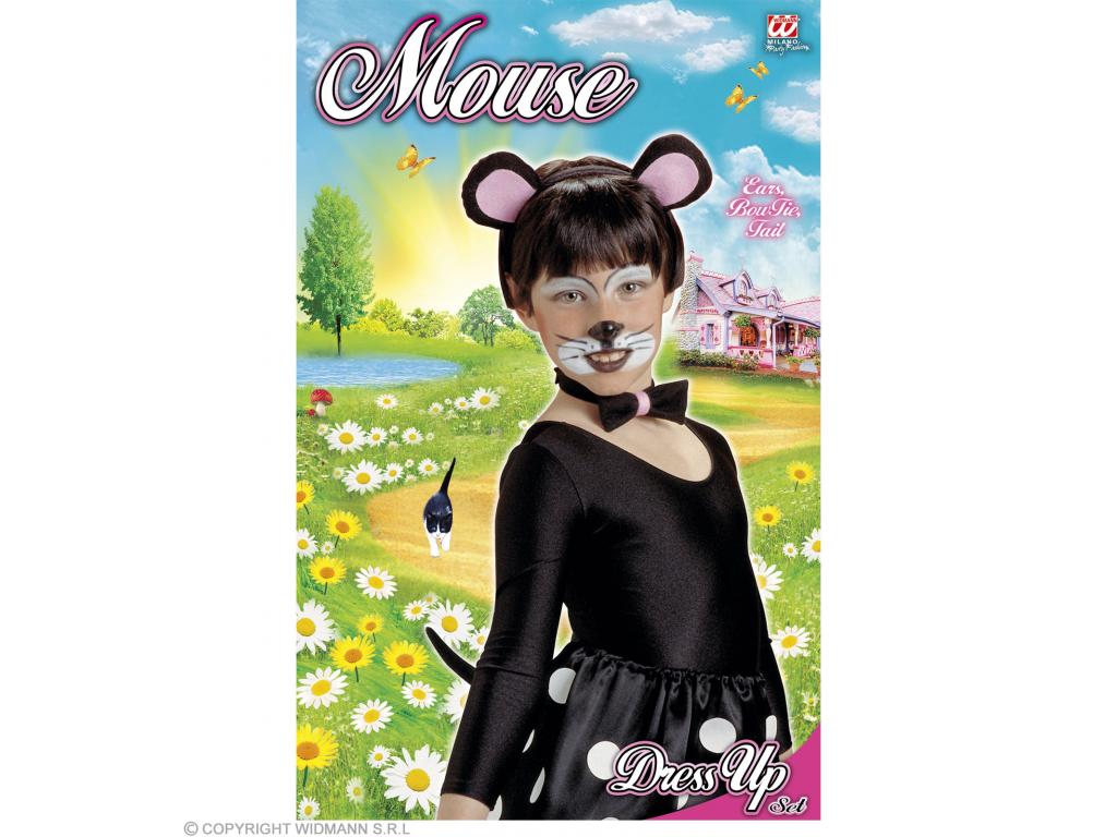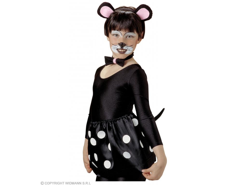 Egérke gyermek jelmezkiegészítő, részei: csokornyakkendő, farok, hajpántra rögzített fülek - fekete/rózsaszín. Ruhát nem tartalmaz, csak jelmezkiegészítő.
