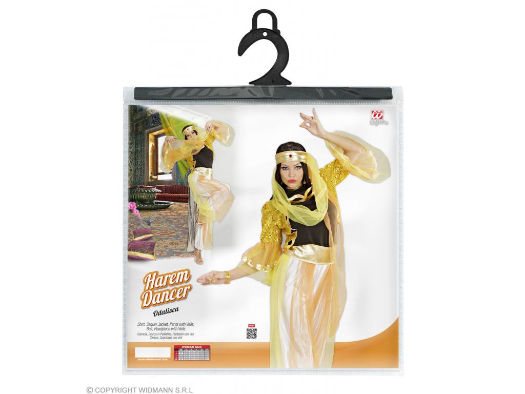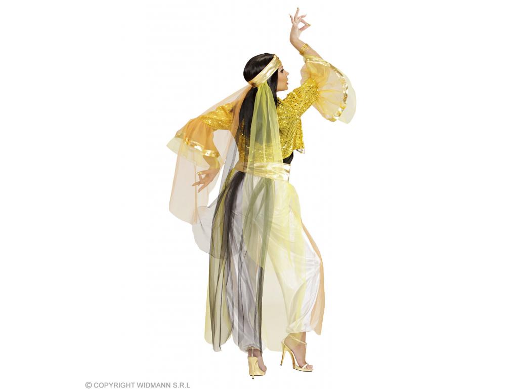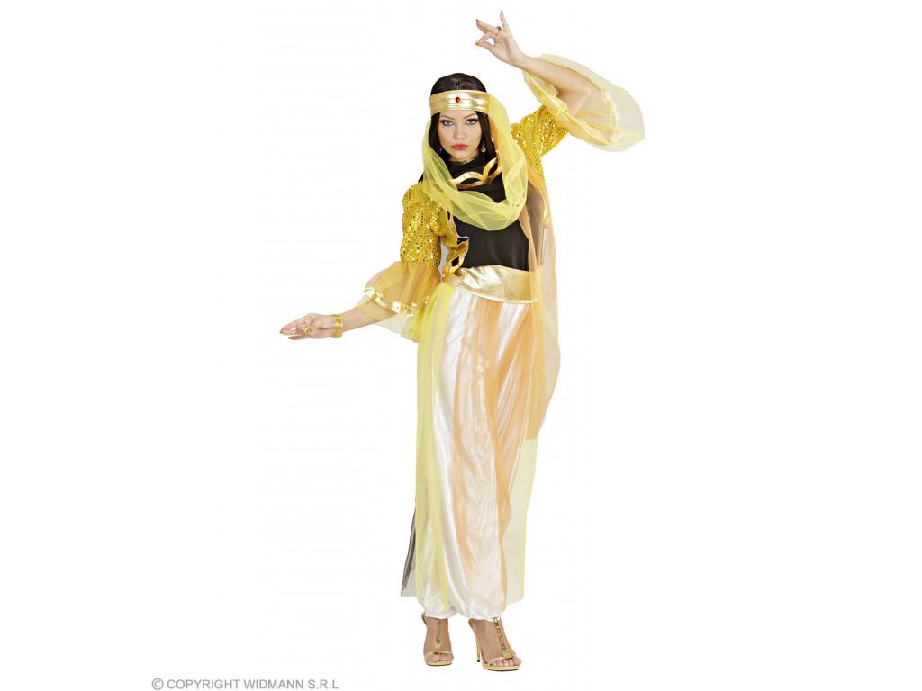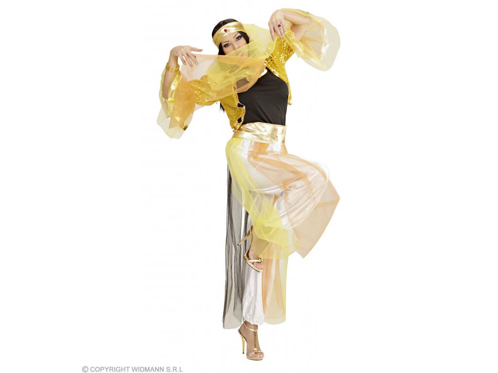 Részei: fehér nadrág sárga fátyollal, fekete felso, flitteres arany mellény, aranyszínu öv, fátyol+fejdísz. Hárem hölgy jelmez, gyönyöru kialakítás, mely garantáltan a figyelem középpontjába állít majd a jelmezes mulatságokon!