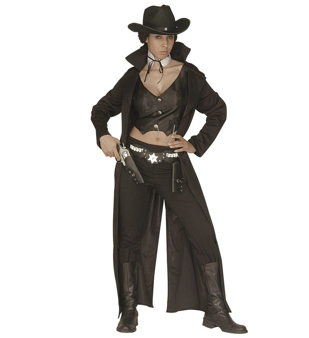 Részei: hosszú fekete kabát, hátul hosszú vágással, fekete ujjatlan boleró (hátul cipzáras), és egy nyakban hordható fehér kendő. Más kiegészítők, pl. fegyver, kalap, stb. nem részei a jelmeznek. A vadnyugati fejvadászok között már a hölgyek is helyet kérnek! Aki ezt a jelmezt viseli a jelmezbálban, biztosan lenyűgözi a férfiakat. A további kiegészítőket keresd áruházunk kínálatai között.