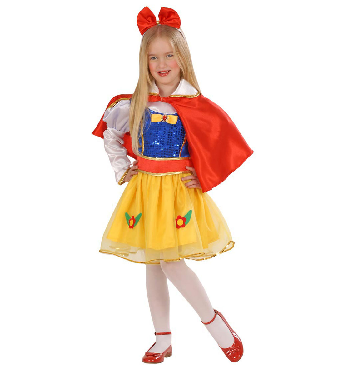 Ruha övvel és köpeny, hajpánt és masni. Mesebeli hercegnő jelmez kislányoknak. Szép rövid szoknyás, kék-sárga-piros hercegnő ruha, övvel és piros köpennyel. Mérete: 98. Mellkas kb.. 62 cm, derék kb.. 42-52 hossza, ruha váll varrástól kb 58 cm.