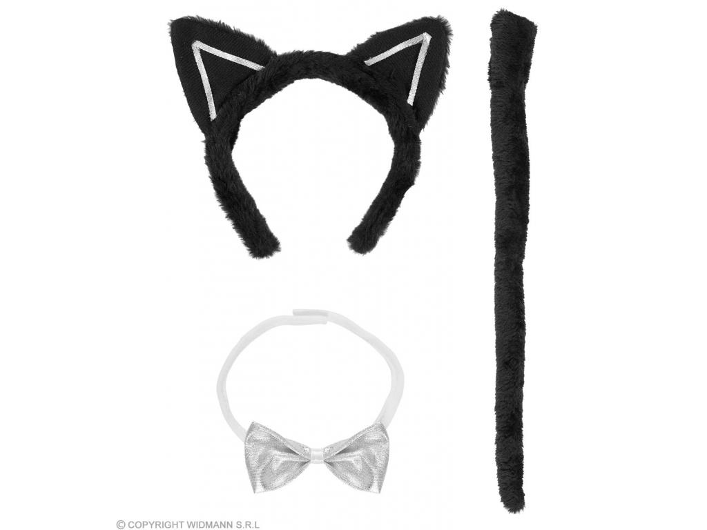 Macska jelmez kiegészítő szett: farok, hajpántra rögzített fülek, tépőzáras ezüst/fehér csokornyakkendő. Csak kiegészítő, ruhát nem tartalmaz.