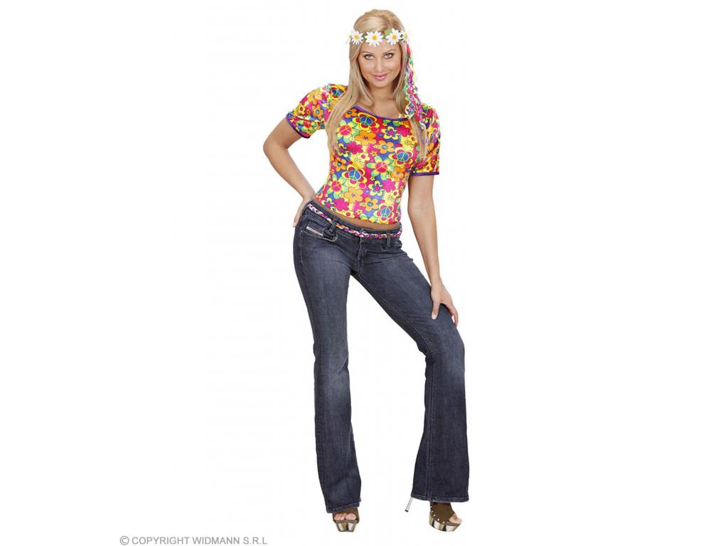 Jelmezkiegészítő hippie jelmezekhez: Tökéletes Hippi ruhádhoz, elengedhetetlen a színes virágokkal mintázott, bársony szegélyes, rövid ujjú, elasztikus anyagú póló. Rugalmas pamut anyaga kényelmes viseletet kölcsönöz. Mást nem tartalmaz!