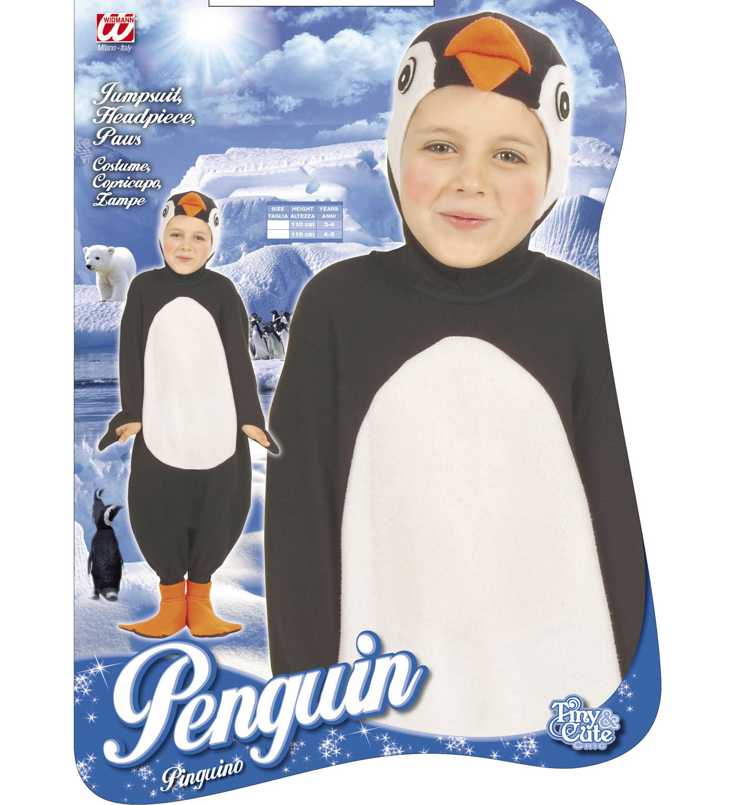 Pingvin - gyermek jelmez szett, részei: fekete-fehér egyrészes kezeslábas, pingvin fejmaszk (kapucni), cipőre húzható uszonyok. Tetőtől talpig pingvinné változhatsz ezzel a jelmezzel - farsangi bál előtt már csak a szárazföldi uszonnyal járást kell megtanulni.