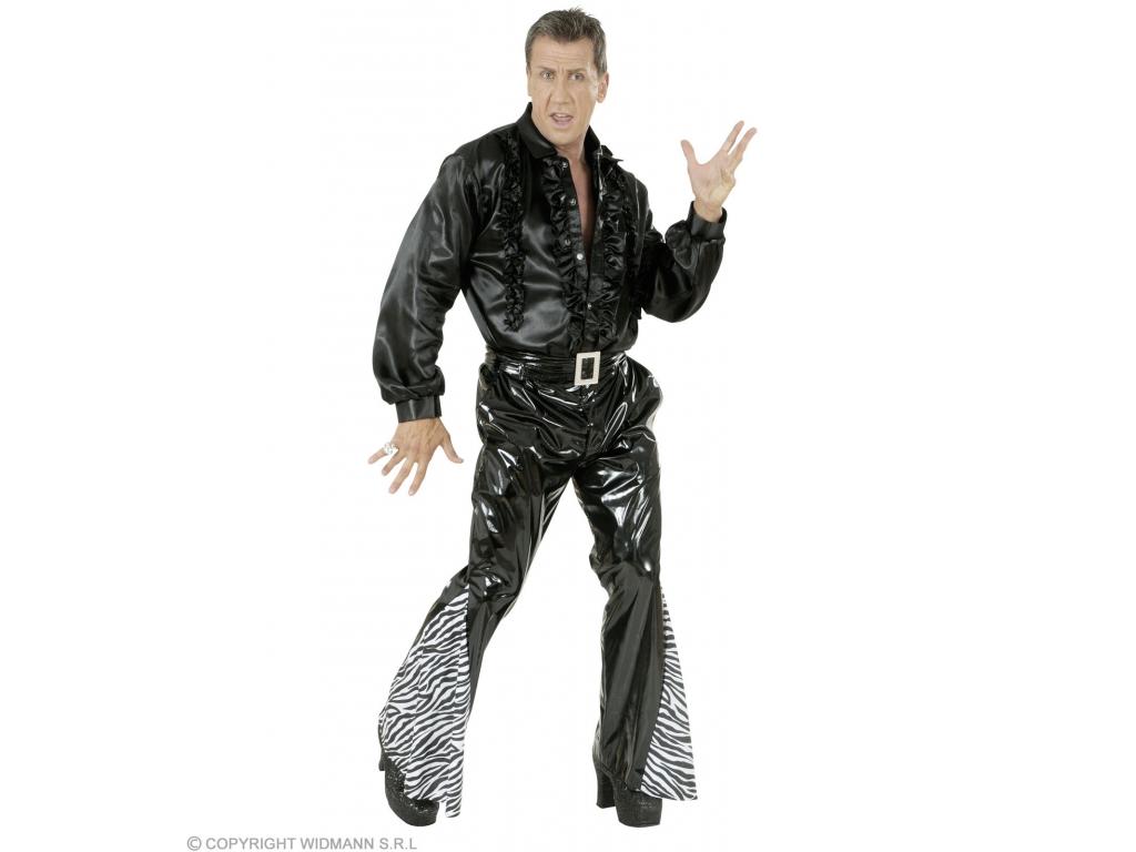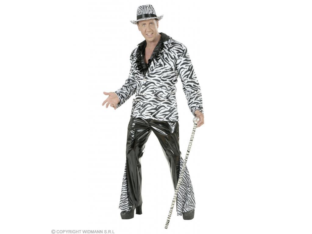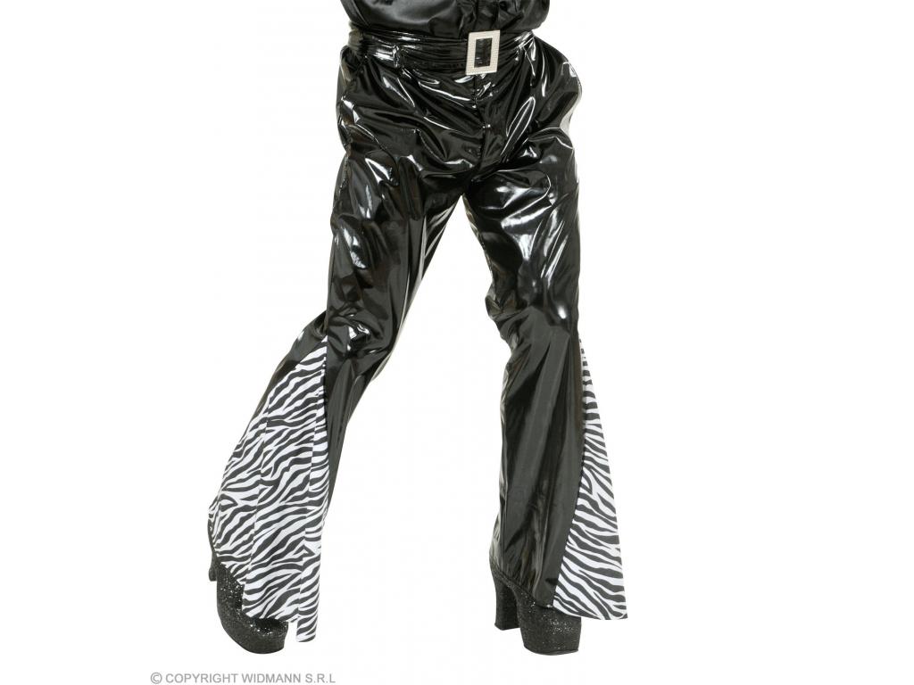 Felnőtt jelmezkiegészítő: fekete színű trapéznadrág, fekete-fehér zebracsíkos mintával díszítve. Poliészter/poliuretán anyagból. Csak jelmezkiegészítő, inget, zakót, kalapot nem tartalmaz. Funky és retro partikon jelenhetünk meg laza eleganciával, ha ezt a nadrágot a hozzá illő kiegészítő darabokkal hordjuk.
