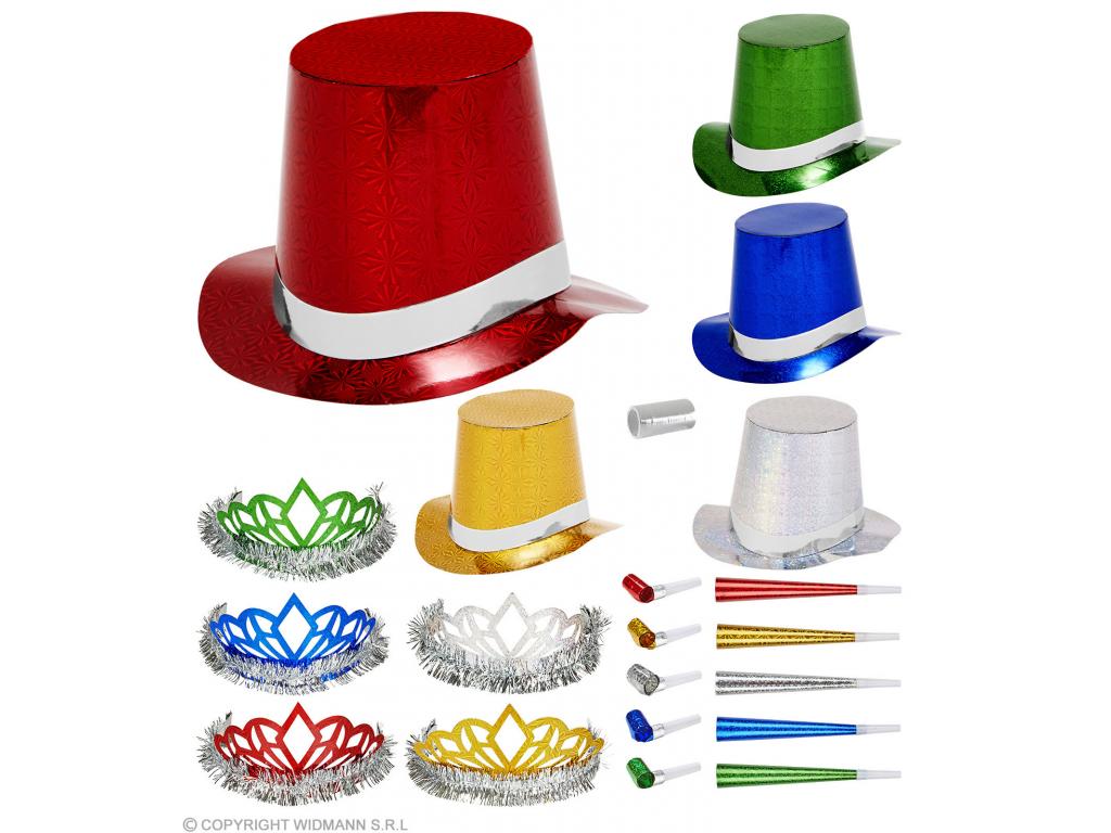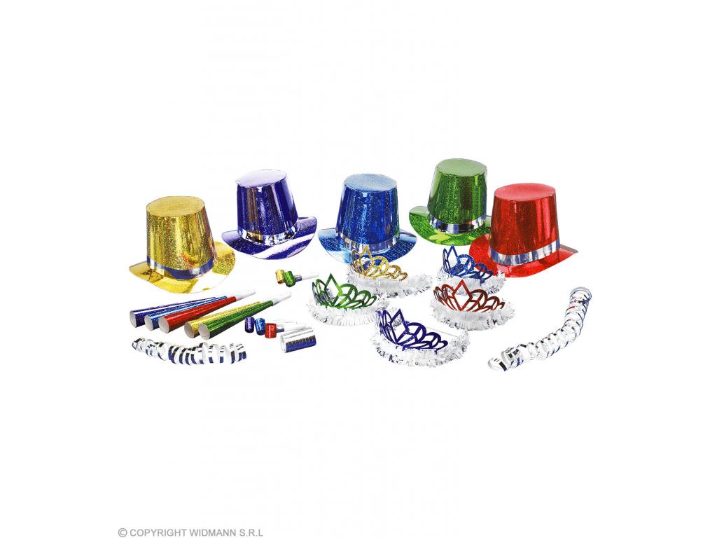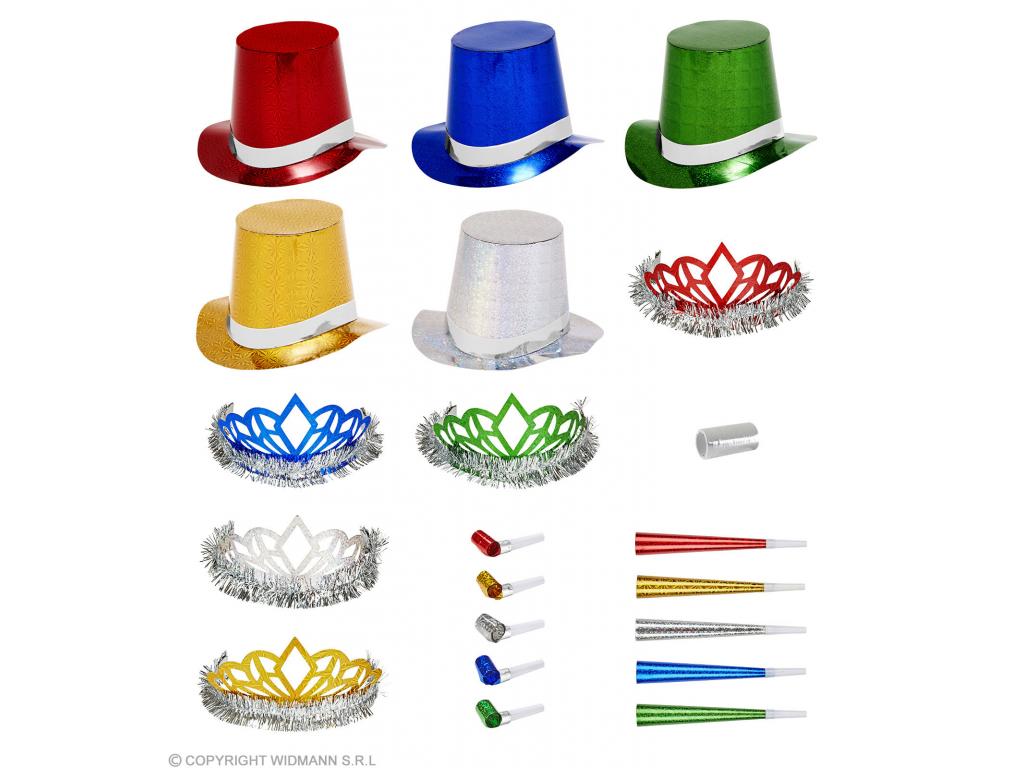 Party szett 5-10 fő részére, többféle vegyes színben, csillogó hologramos. A csomag kalapokat, fejdíszeket, trombitákat, szerpentint, sípot, anyósnyelvet/ördögnyelvet tartalmaz, 5-10 fő részére. Szilveszterre, farsangra, partikra ideális és nélkülözhetetlen kiegészítők gyűjteménye!