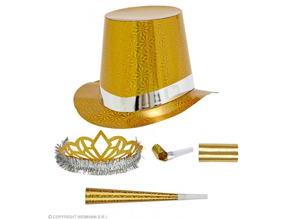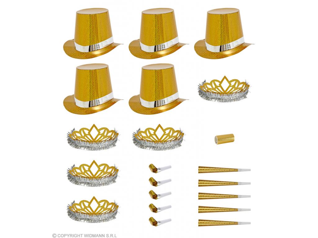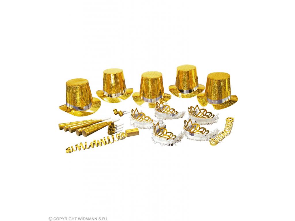 Party szett 5-10 fő részére, aranyszínű, csillogó hologramos. A csomag kalapokat, fejdíszeket, trombitákat, szerpentint, sípot, anyósnyelvet/ördögnyelvet tartalmaz, 5-10 fő részére. Szilveszterre, farsangra, partikra ideális és nélkülözhetetlen kiegészítők gyűjteménye!