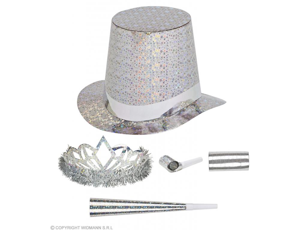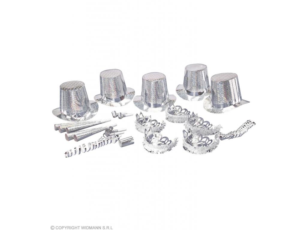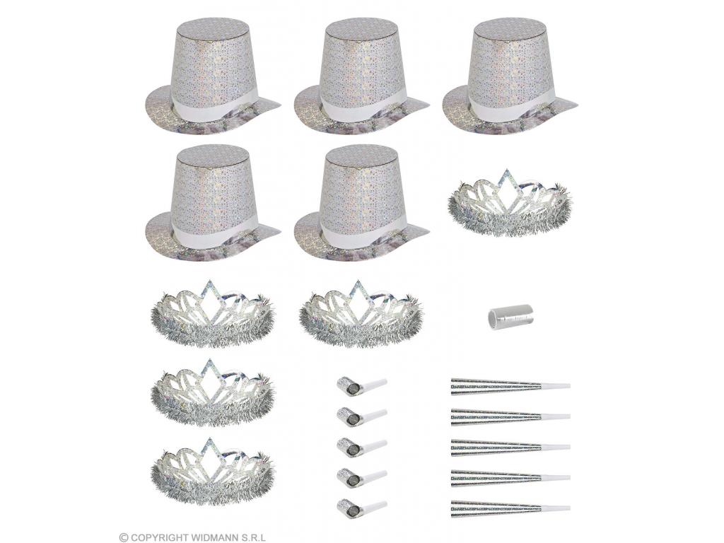 Party szett 5-10 fő részére, ezüstszínű, csillogó hologramos. A csomag kalapokat, fejdíszeket, trombitákat, szerpentint, sípot, anyósnyelvet/ördögnyelvet tartalmaz, 5-10 fő részére. Szilveszterre, farsangra, partikra ideális és nélkülözhetetlen kiegészítők gyűjteménye!