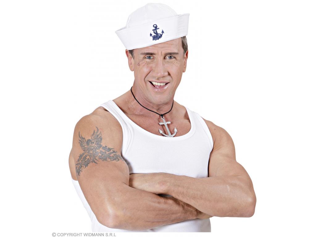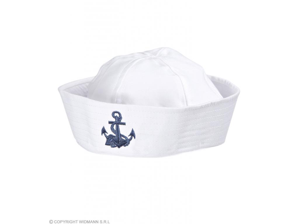 Fehér matróz sapka, kék horgonnyal díszítve. Átmérő: kb. 18 cm. Egységes felnőtt méret. Csak jelmezkiegészítő, tehát a képeken látható egyéb jelmezt, ruhadarabokat, illetve kiegészítő kellékeket nem tartalmazza. Tengerész, matróz jelmezének nélkülözhetetlen kiegészítője.