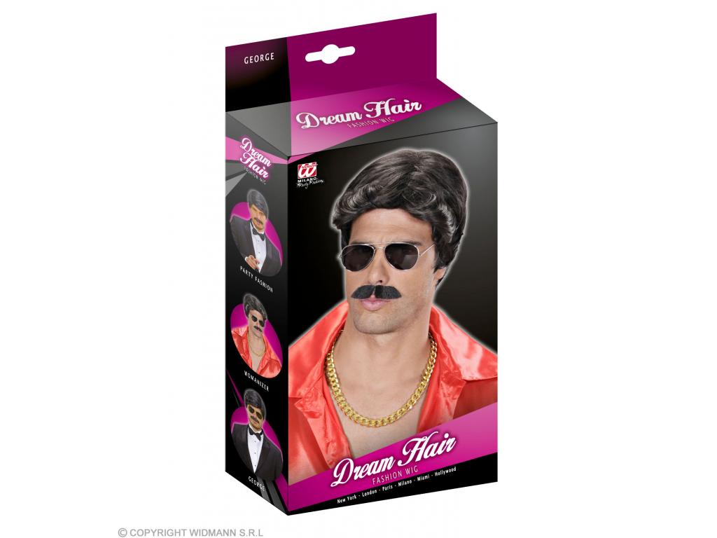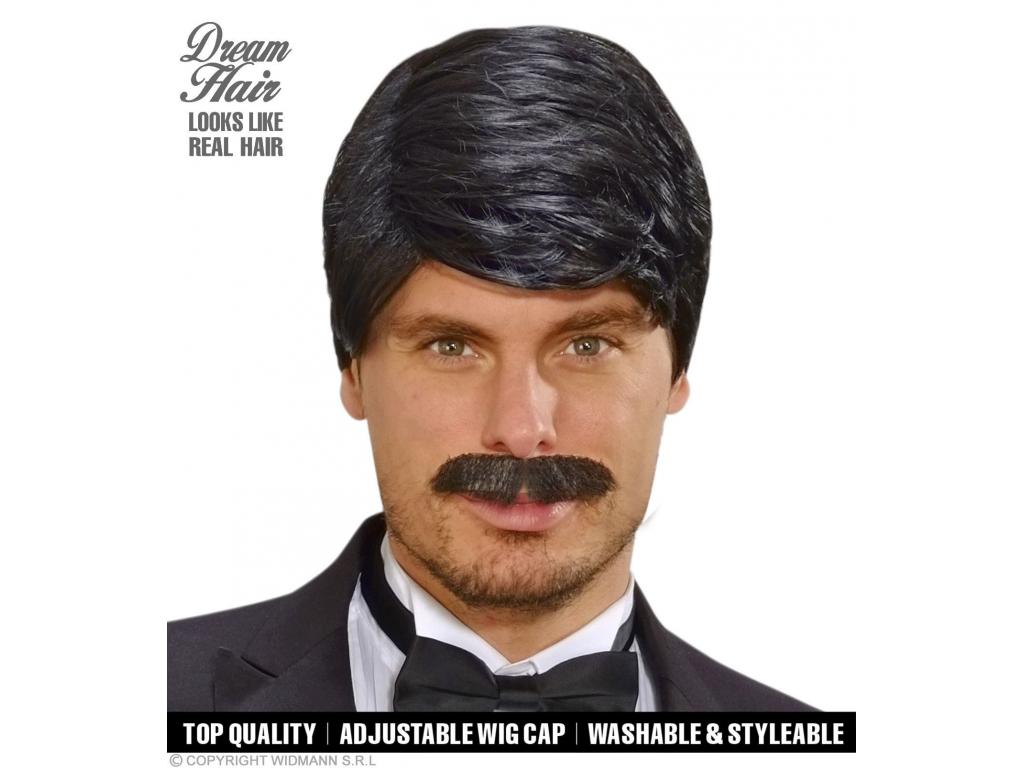 Férfi jelmezkiegészítő szett: fekete színű rövid hajú paróka, fekete színű bajusz. Egységes felnőtt méret. Csak jelmezkiegészítő, tehát a képen látható jelmezt, és többi kiegészítőt stb. nem tartalmazza. Dobozos csomagolásban. Elegáns férfi paróka, mely nem csak playboy, hanem más jelmezekhez is kitűnően illik.