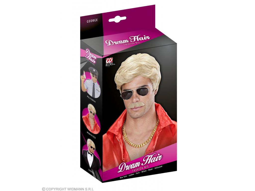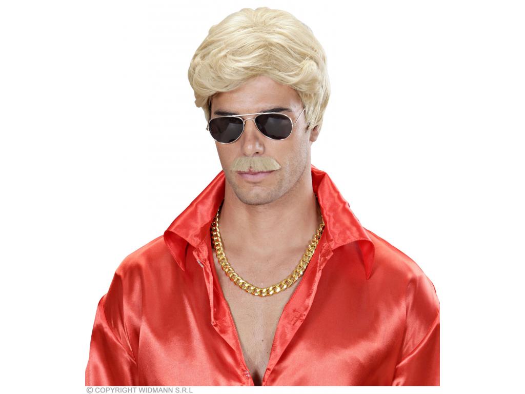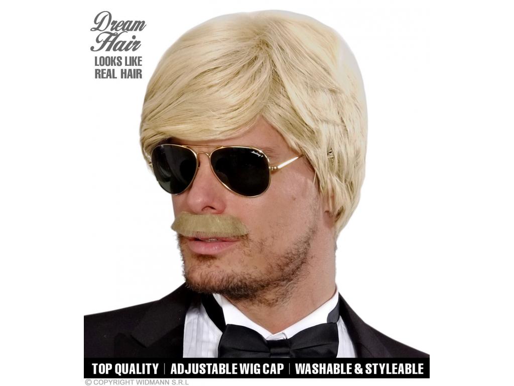 Férfi jelmezkiegészítő szett: szőke színű rövid hajú paróka, szőke színű bajusz. Egységes felnőtt méret. Csak jelmezkiegészítő, tehát a képen látható jelmezt, és többi kiegészítőt, szemüveget, stb. nem tartalmazza. Dobozos csomagolásban. Elegáns férfi paróka, mely nem csak playboy, hanem más jelmezekhez is kitűnően illik.