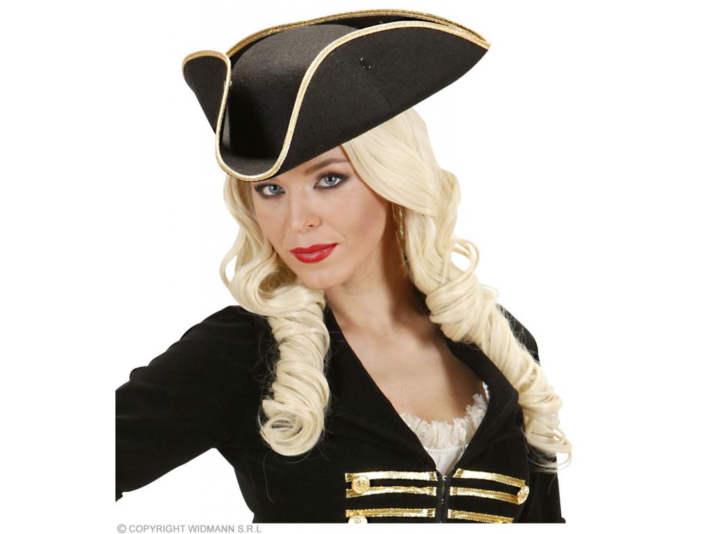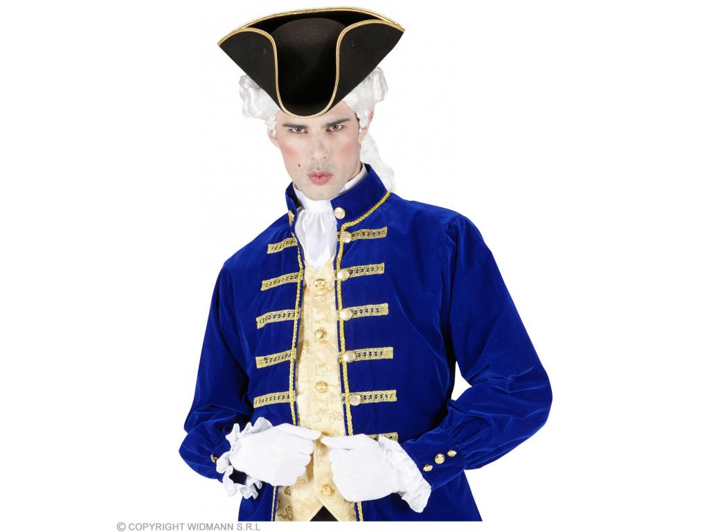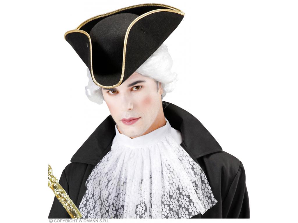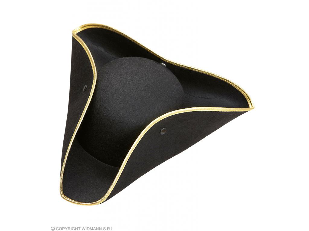 Háromszögletű kalap, fekete filc anyagból, arany szegéllyel díszítve. Szélesség: kb. 34 cm. Magasság: 10 cm. Egységes felnőtt méret. Csak jelmezkiegészítő, jelmezt, más kelléket nem tartalmaz! A klasszikus barokk-rokokó háromszögletű kalap, mely többféle történelmi kosztümhöz is remekül illő kiegészítő lehet, legyen az nemes úriember, vagy kalózhölgy.