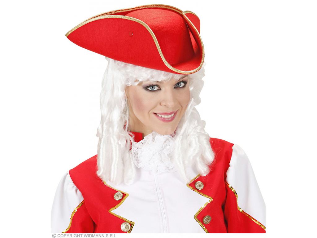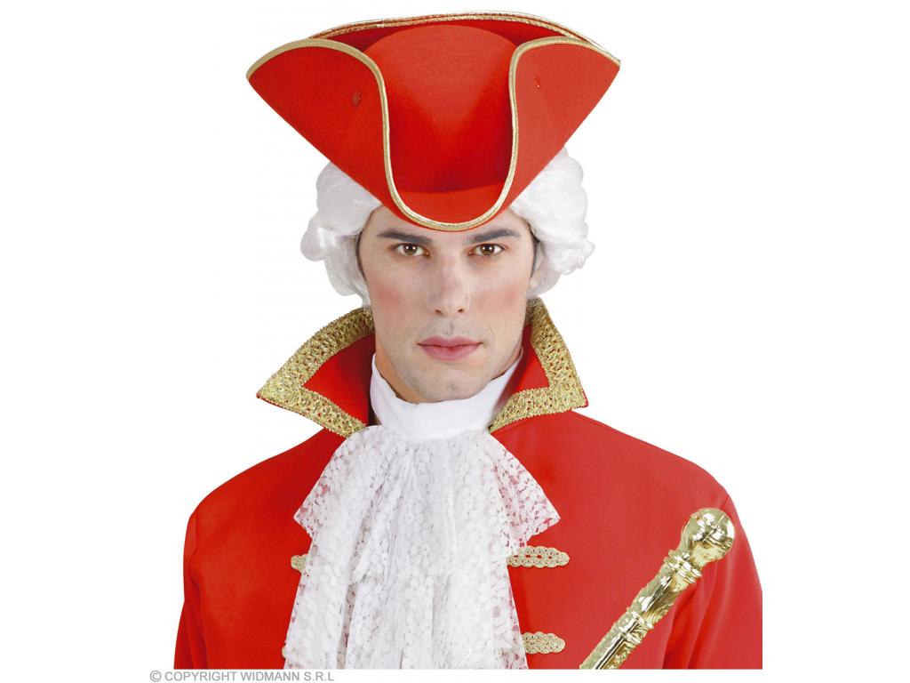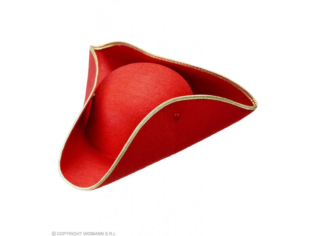 Háromszögletű kalap, piros filc anyagból, arany szegéllyel díszítve. Szélesség: kb. 34 cm. Magasság: 10 cm. Egységes felnőtt méret. Csak jelmezkiegészítő, jelmezt, más kelléket nem tartalmaz! A klasszikus barokk-rokokó háromszögletű kalap, mely többféle történelmi kosztümhöz is remekül illő kiegészítő lehet, legyen az nemes úriember, vagy kalózhölgy.