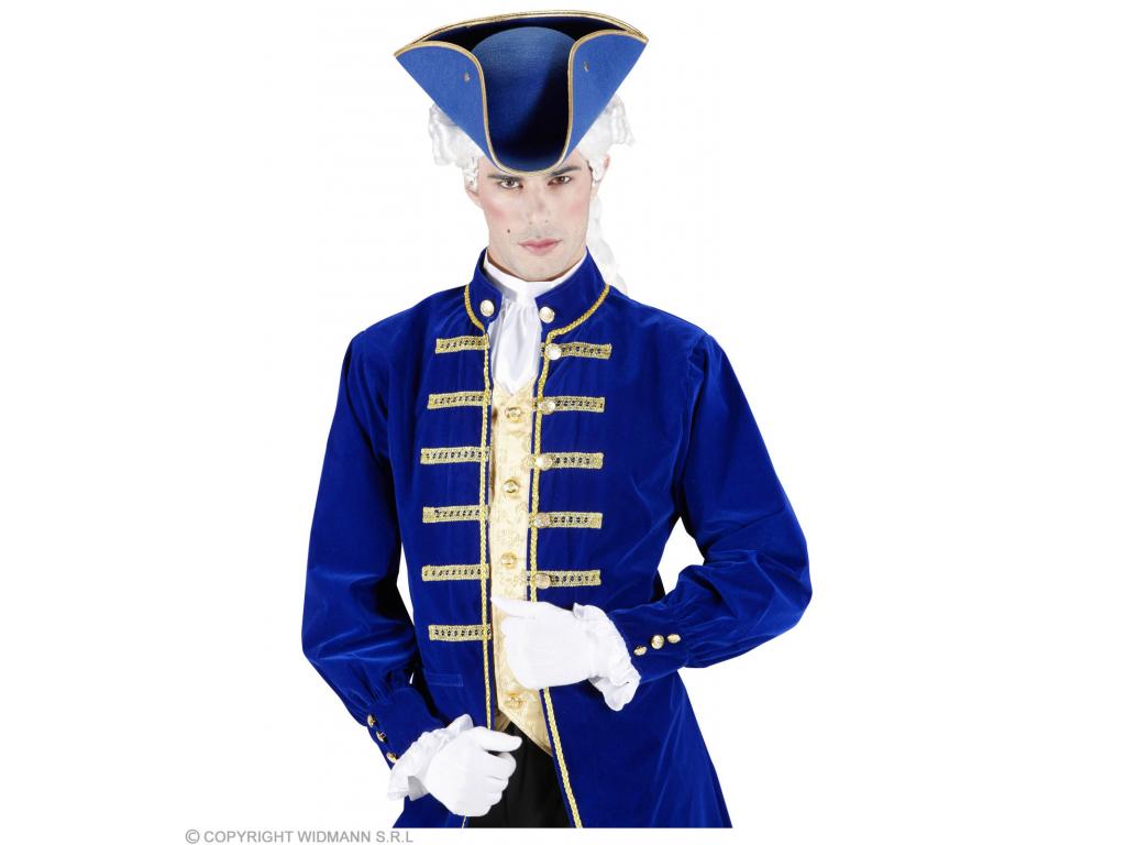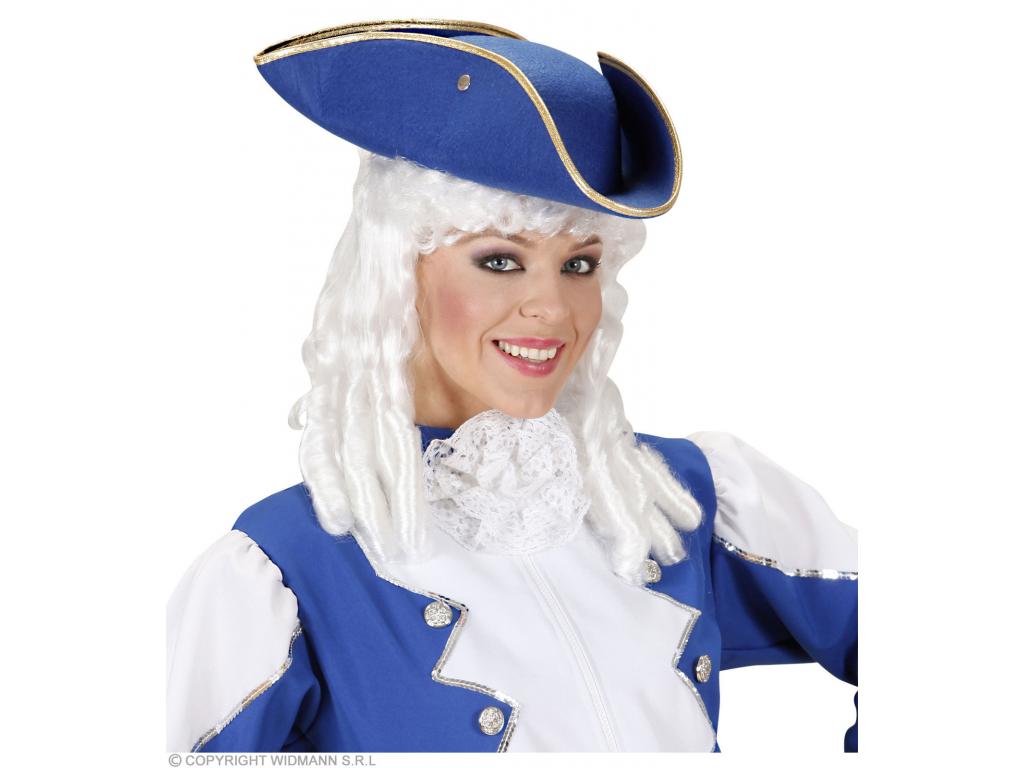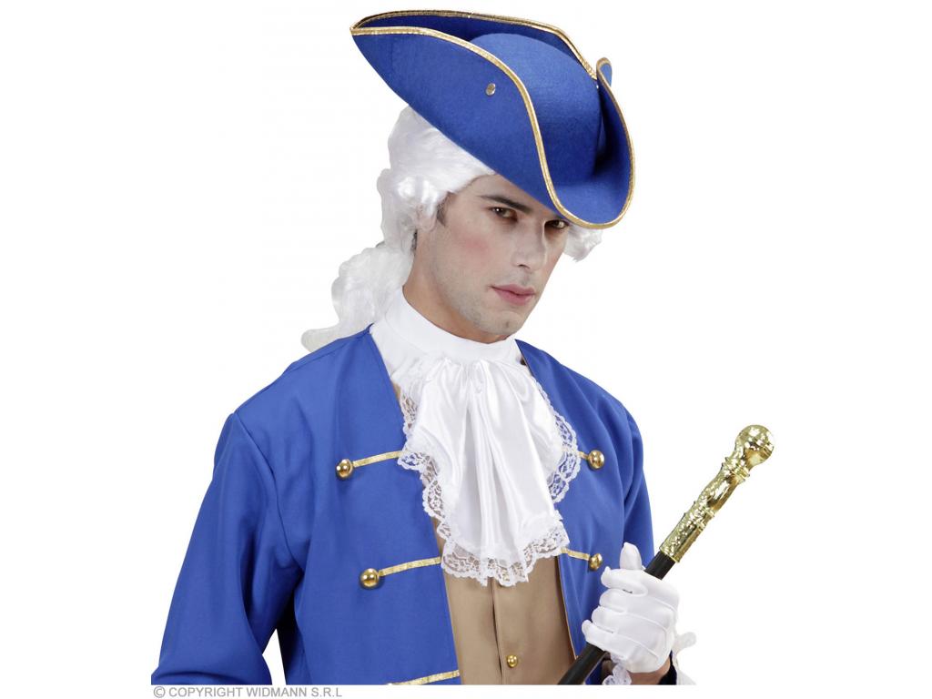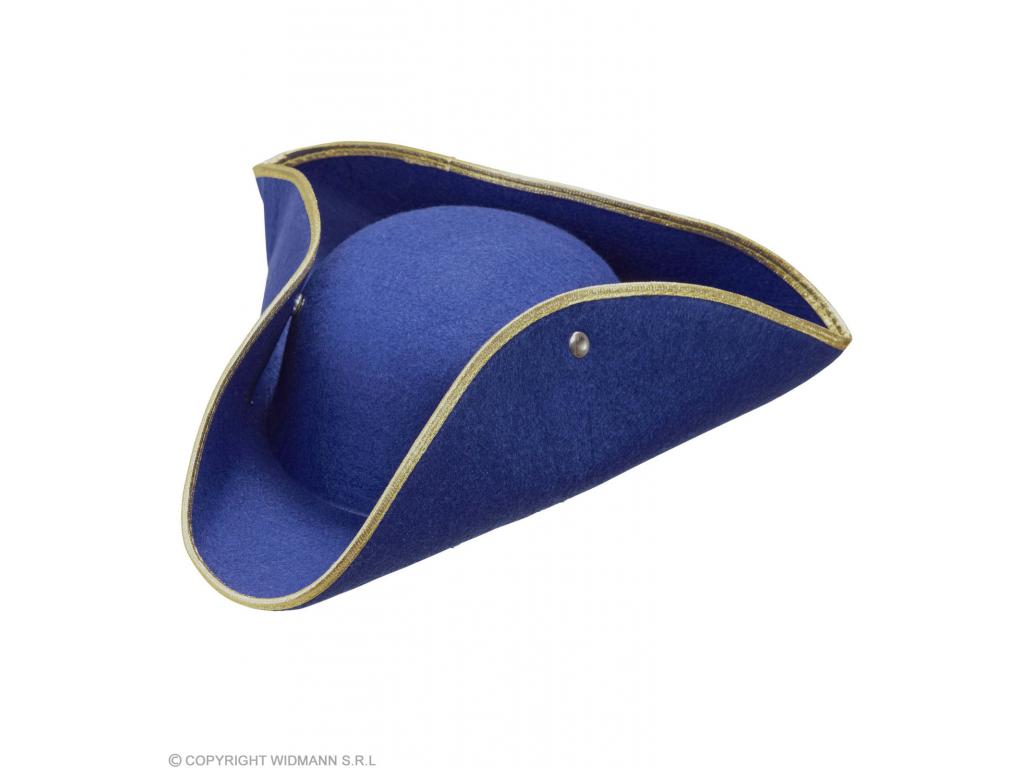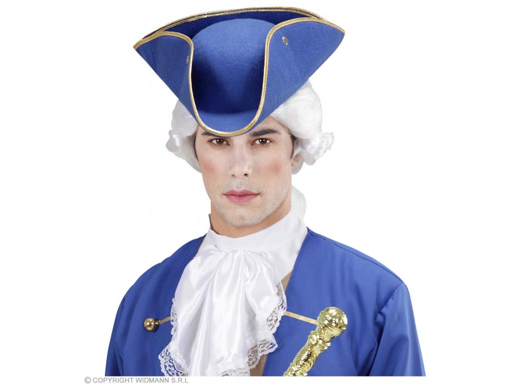 Háromszögletű kalap, kék filc anyagból, arany szegéllyel díszítve. Szélesség: kb. 34 cm. Magasság: 10 cm. Egységes felnőtt méret. Csak jelmezkiegészítő, jelmezt, más kelléket nem tartalmaz! A klasszikus barokk-rokokó háromszögletű kalap, mely többféle történelmi kosztümhöz is remekül illő kiegészítő lehet, legyen az nemes úriember, vagy kalózhölgy.