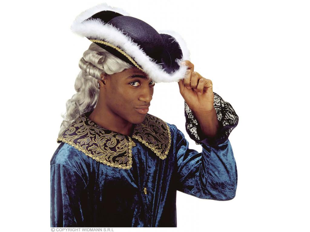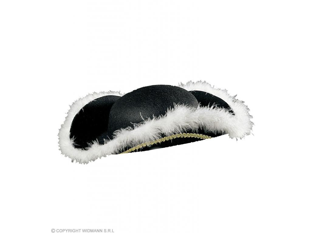 Fekete színű háromszögletű filckalap, arany szegéllyel, és fehér marabu toll szegéllyel díszítve. Egységes felnőtt méret. Csak jelmezkiegészítő, jelmezt, más kelléket nem tartalmaz! Barokk, rokokó és más történelmi kosztümének elegáns kiegészítője lehet, kalóz jelmezekhez is ajánljuk.