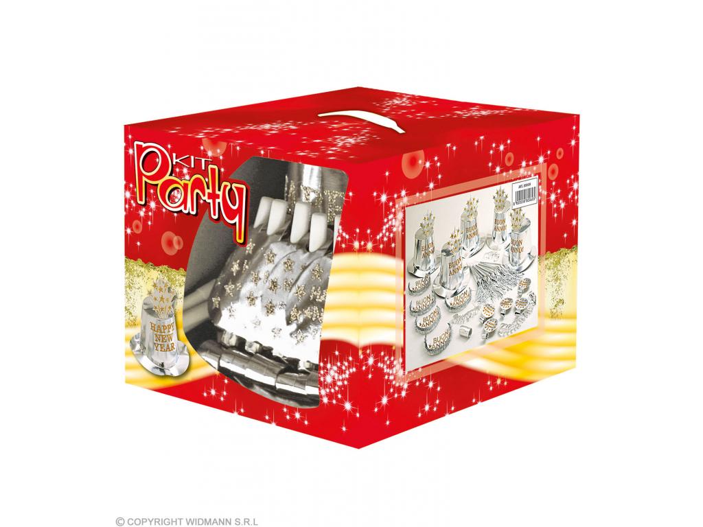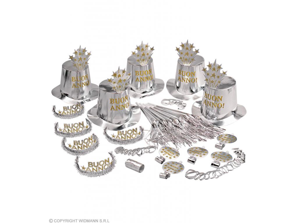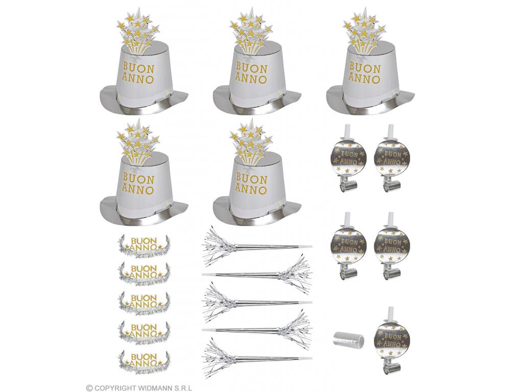 Szilveszteri party jelmezkiegészítő és dekorációs szett, 5-10 fő részére. Csillogó ezüstszínűek, Buon Anno (BÚÉK) felirattal. A csomag 5 cilinderkalapot, 5 diadém koronát, 5 trombitát, 1 tekercs (10 db) szerpentinszalagot, 5 anyósnyelv sípot tartalmaz. Anyaga: papírkarton, fólia. Egységes felnőtt méret. Ezzel a party szettel egy kisebb baráti társaság már elindulhat a szilveszter esti bulikba, a gondtalan és vidám ünnepi hangulat biztosítva van!