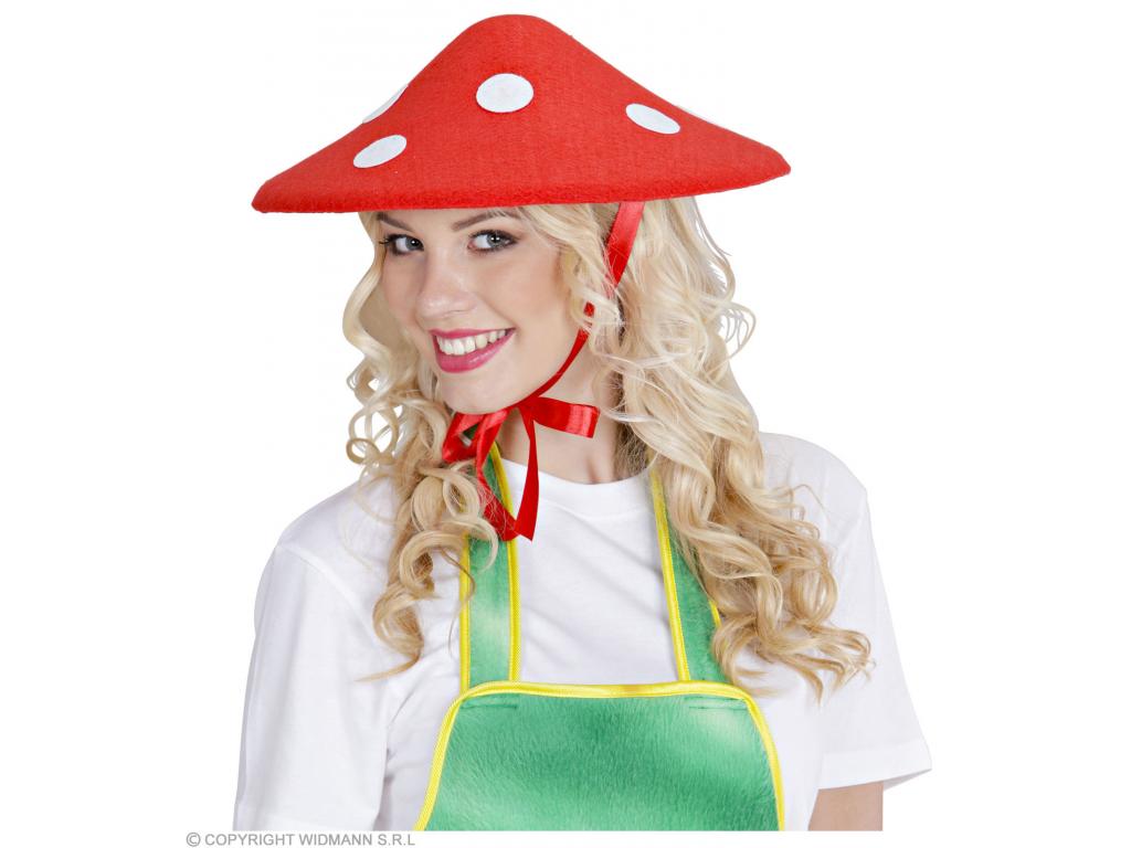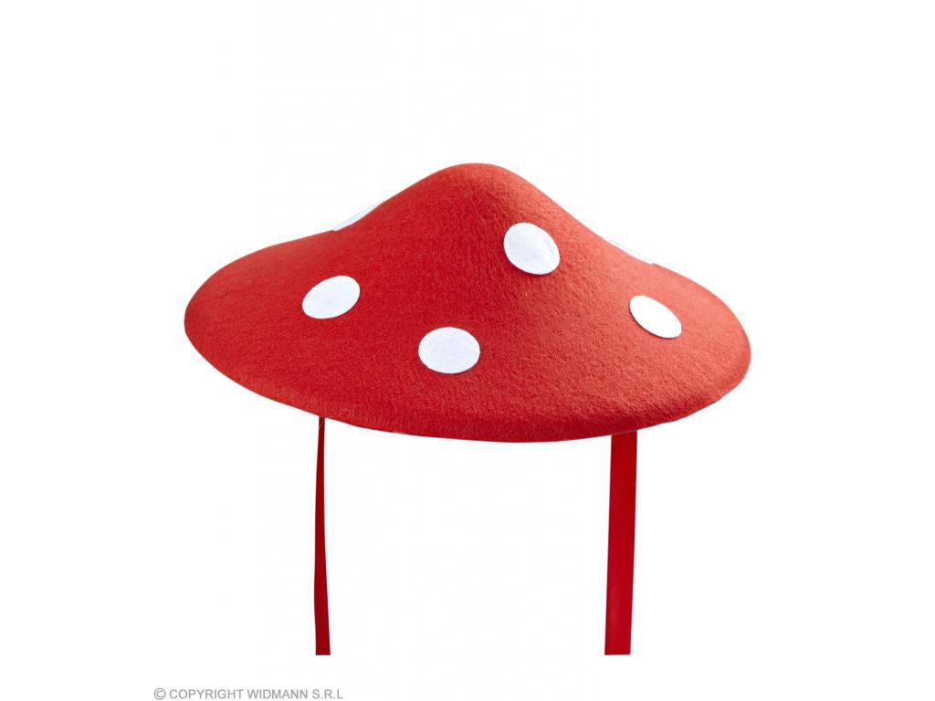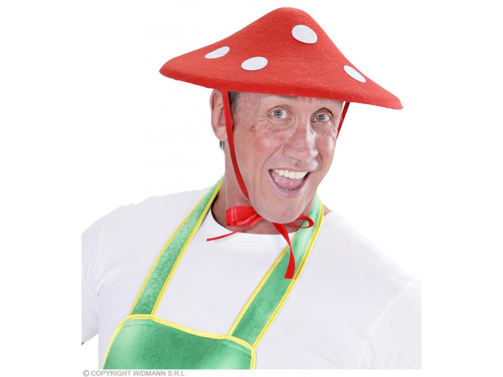 Gombafej formájú, piros filckalap, fehér pöttyekkel, piros szalaggal. Átmérő: 34 cm. Vidám gombakalap, mely többféle karneváli és farsangi jelmez hangulatos és vicces kiegészítője lehet.