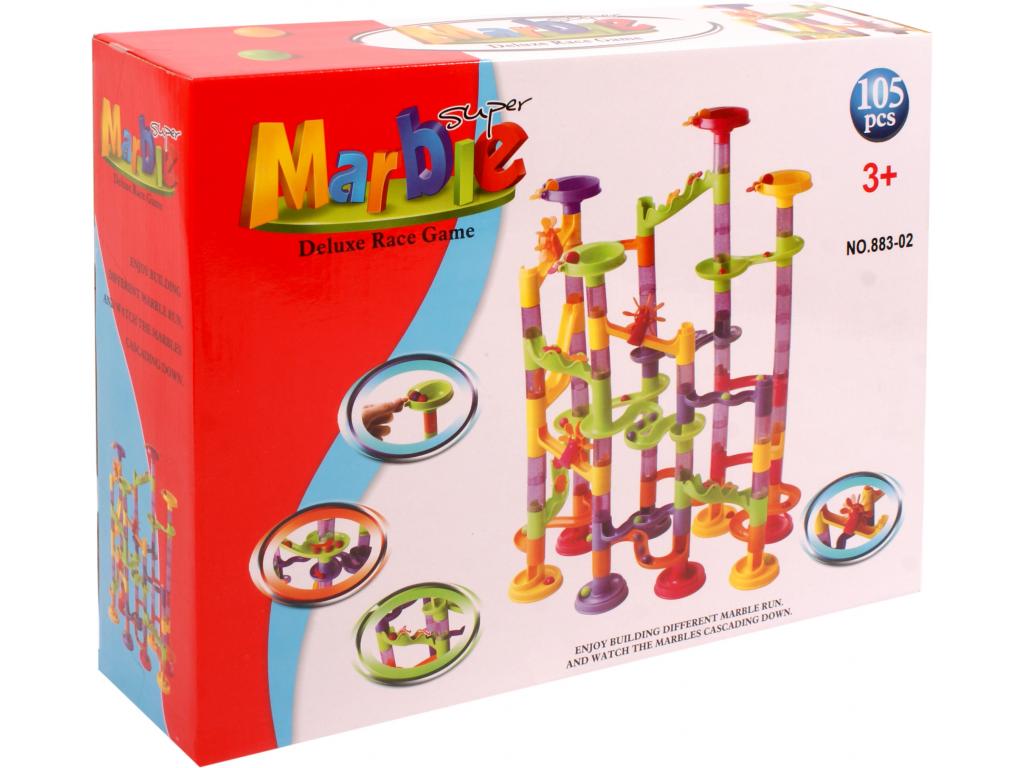 Műanyag golyópálya, mely nagyon jól fejleszti a fantáziát. A pálya műanyag elemekből áll, többféleképpen összeillesztő, építhető. Indítsd el a golyókat a tetejéről, majd kísérd végig az útját egészen az alsó tálkáig! A készlet 105 db-os.