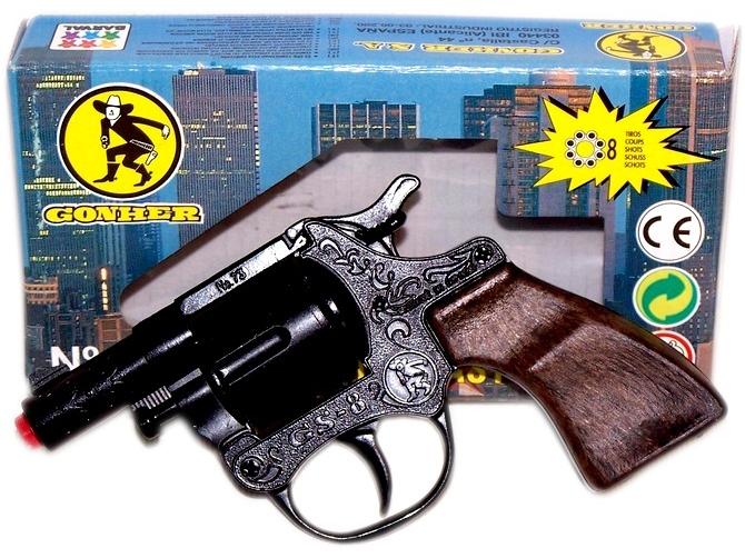 Az ifjú detektívek első fegyvere lehet ez a kis méretű, jól elrejthető, 8-as patronnal működő pisztoly. Markolatának borítása fa hatású. A csomagolás a patronokat nem tartalmazza, külön megvásárolhatóak.