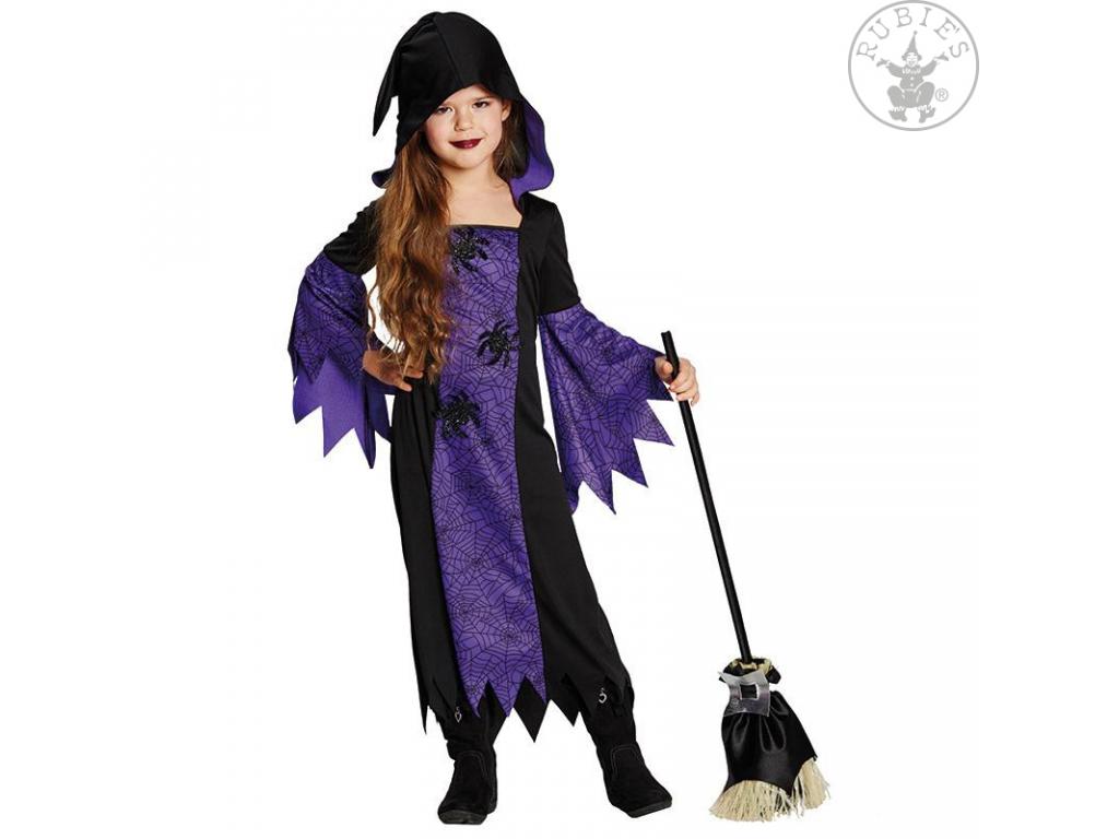 A Boszorkány jelmez lila lány jelmez leírása: Egy lila fekete kapucnis csipke ruha gyerekeknek a ruhán és az ujján nyomtatott pók díszítésekkel. Az ujjak és a ruha is csipkézett és mellkason három varrott pókkal is díszítve van.