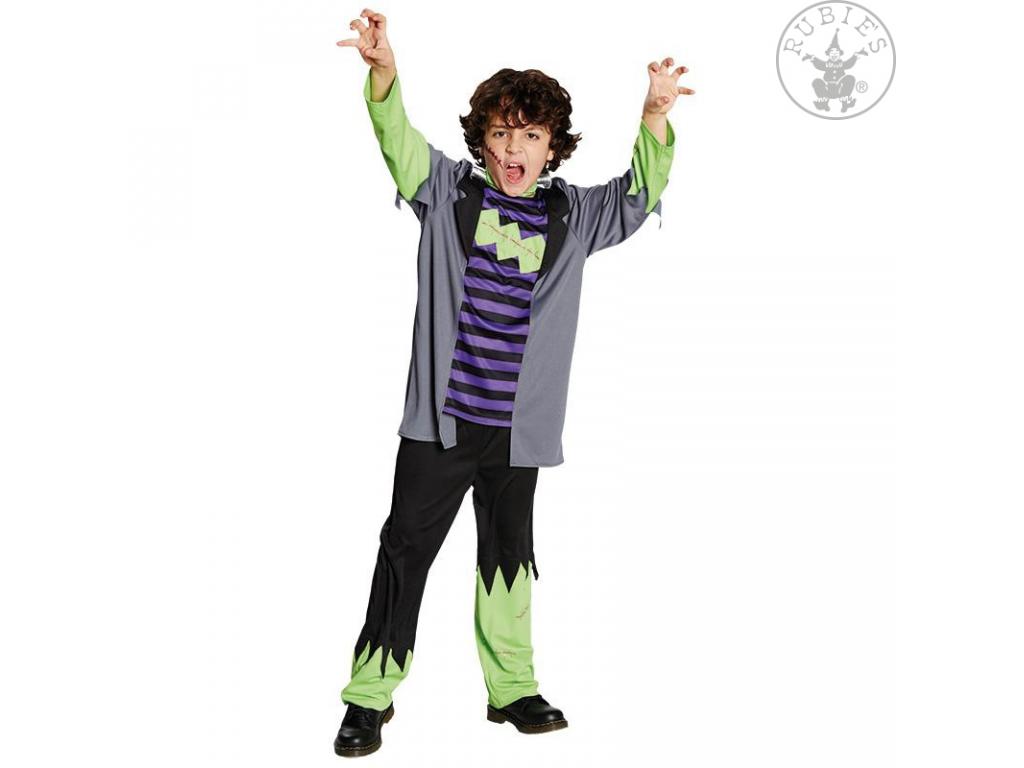 A Funky szörny fiú jelmez leírása: A három részből álló Monster jelmez gyerekeknekkészült, a szett nadrágból a felsőből és a gallér részből áll. A nadrág fekete szivacsos anyagból készült, zöld díszítéssel az alján. A felső, hosszú ujjú és szürke színű. A felső közepére egy lila-fekete csíkos szövet betétet varrtak, melyen egy zöld szaggatott rész is van, mely varrott hegeket imitál, és a nyakán fekete gallér is van. Az ujjakon, mint a nadrág alján is zöld ddíszítés van. A zöld galléron kis ezüst szövet csavarok vannak.