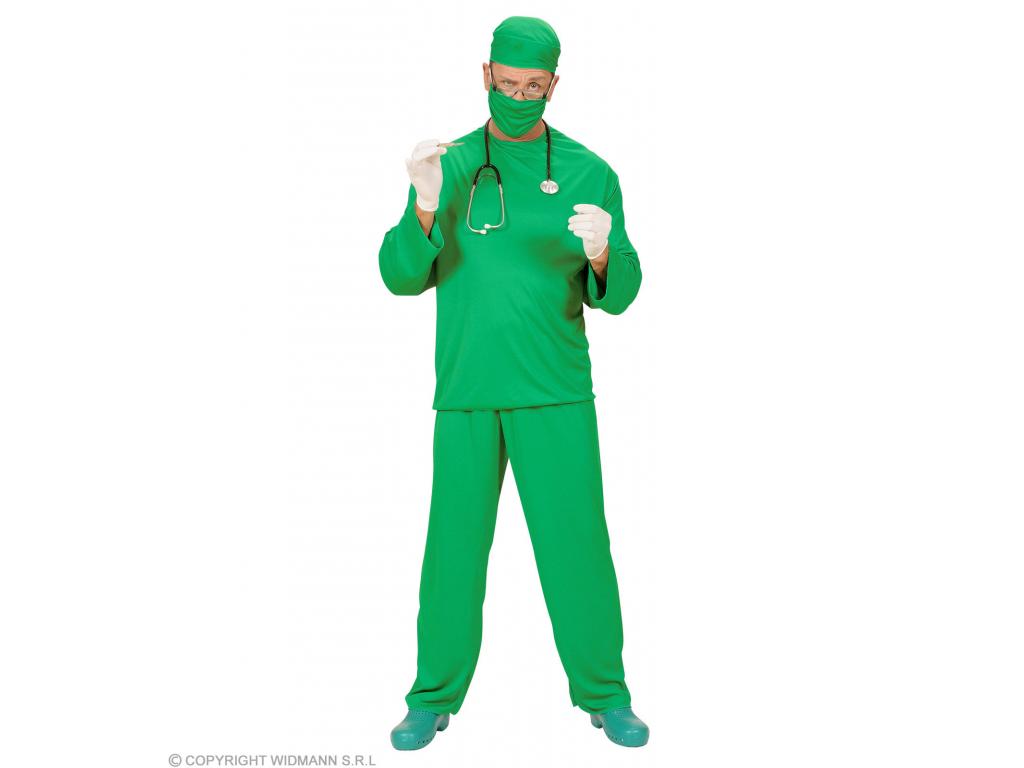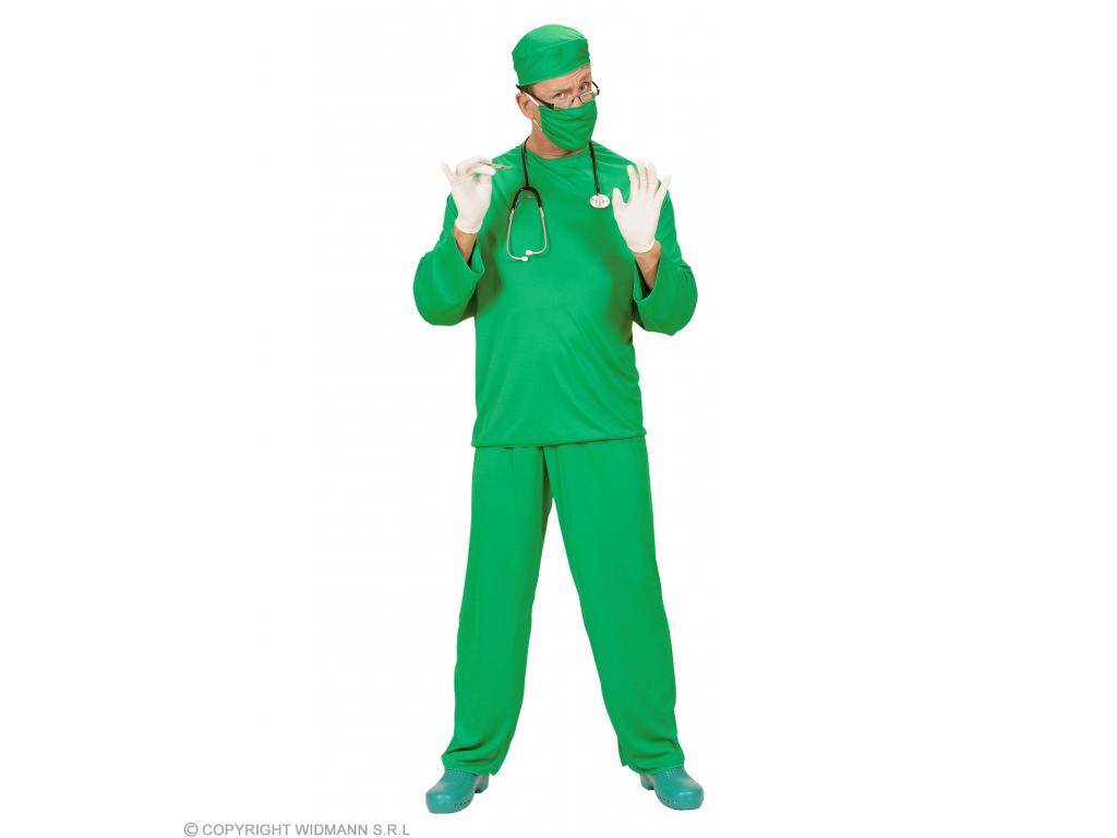 Műtős zöld ruha, mely tartalmazza a felsőrészt, a nadrágot, a fejkendőt és a szájvédőt