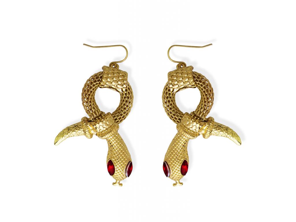 Felnőtt jelmezkiegészítő: 1 pár fülbevaló. - motívum: kígyó, szín: arany, kígyószemek: piros díszkövekből Csak jelmezkiegészítő/kellék, tehát a képeken látható többi jelmezt, kiegészítőt a termék nem tartalmazza!