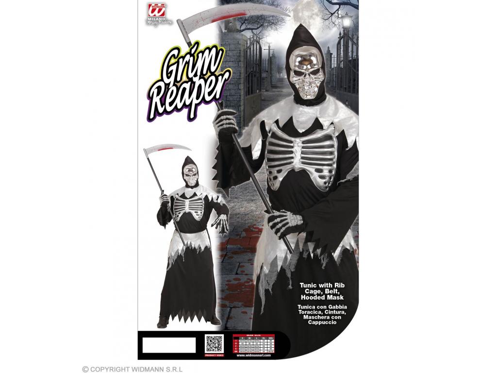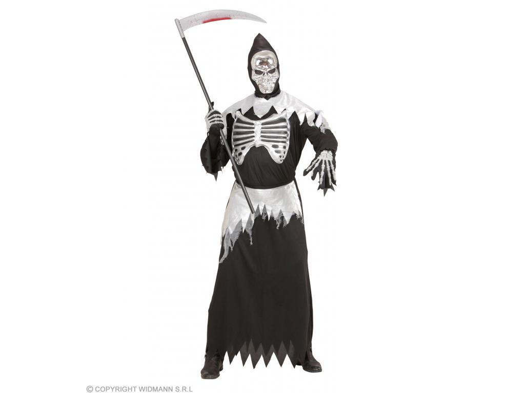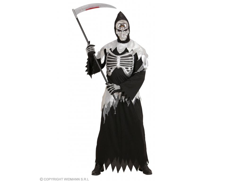 Felnőtt komplett jelmez-szett, részei: fekete színű, kapucnis, hosszú tunika, ezüst színű derék-övvel és gallér-résszel, ezüst színű mellkas-bordákkal, valamint az arcot eltakaró koponya-maszkkal. A kaszát nem tartalmazza (külön rendelhető kiegészítő). Félelmetes csontvázfantomként a legriasztóbb figura lehetsz a Halloween-partin vagy a jelmezbálban. További kiegészítőket keresd áruházunkban!
