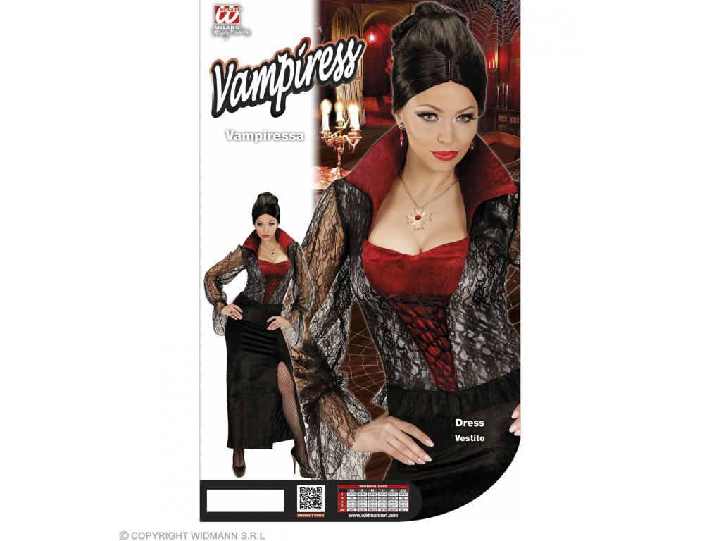 Felnőtt női jelmez: estélyi ruha, combig felsliccelt fekete szoknyával, piros felsőrésszel és gallérral, fekete színű, csipkés bő ujjakkal, valamint elől dísz zsinórozással összekötött csipkés fekete felsőrésszel. A képen látható egyéb kiegészítők (harisnya, ékszer, nyaklánc, paróka, stb.) nem részei a jelmeznek, azok külön beszerezhető jelmezkiegészítők. Elegáns vámpírhölgyként megjelenve bármelyik Halloween rendezvény fénypontja lehet ebben a ruhában. Érdemes további kiegészítőkkel fokozni a hatást: pl. színben hozzá illő harisnya, vagy pedig paróka. Jelmezkiegészítőket, parókákat, harisnyákat, stb. is keresse áruházunkban!