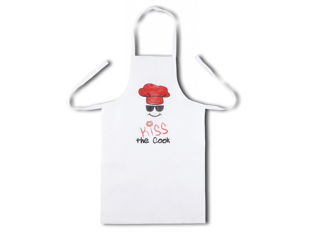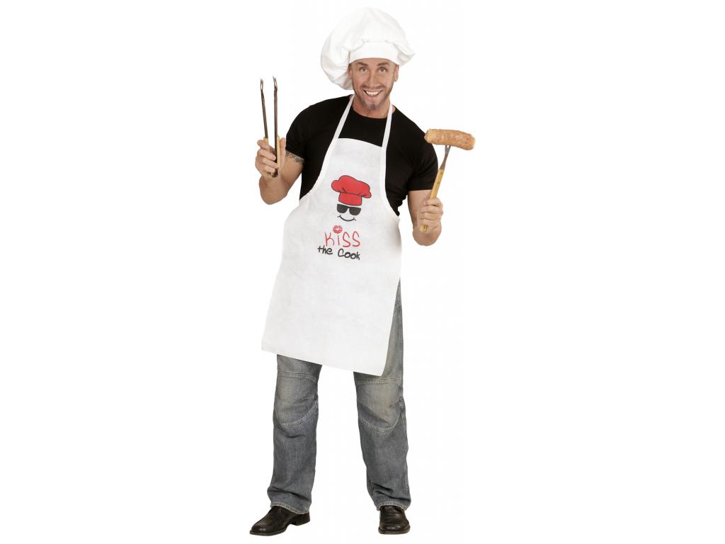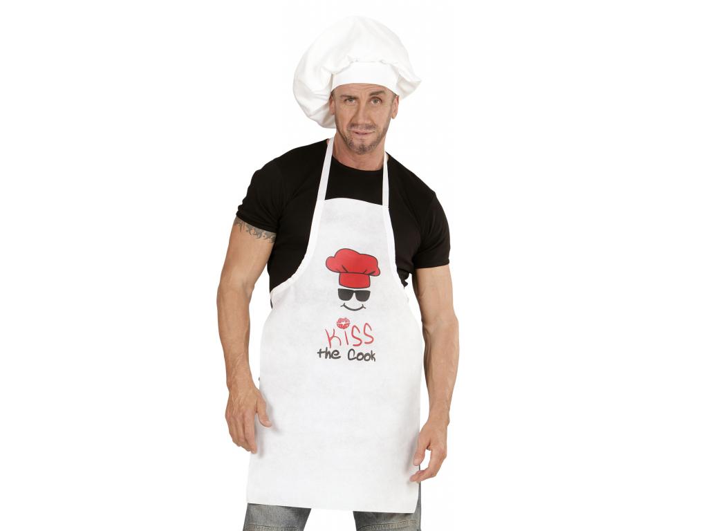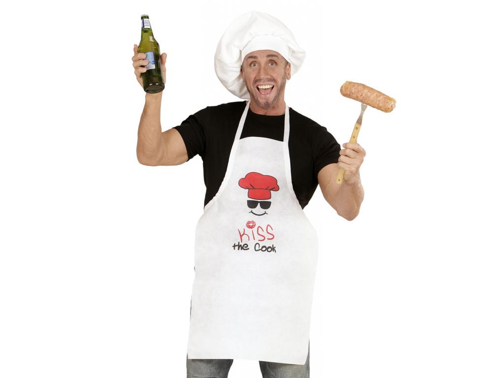 Felnőtt jelmezkiegészítő: fehér színű, nyakba akasztható, hátul megköthető szakács kötény, Kiss the cook felirattal. A képen látható további kiegészítők nem tartoznak a termékhez!
