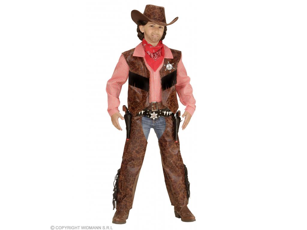 Gyermek cowboy / sheriff jelmez szett, részei: ing barna bőrmellénnyel, a saját nadrágra felhúzható cowboy bőrnadrág kiegészítő, barna cowboykalap. Az öv, pisztoly, kendő, farmernadrág nem részei a szettnek.