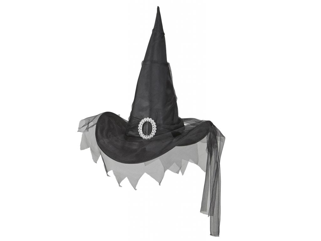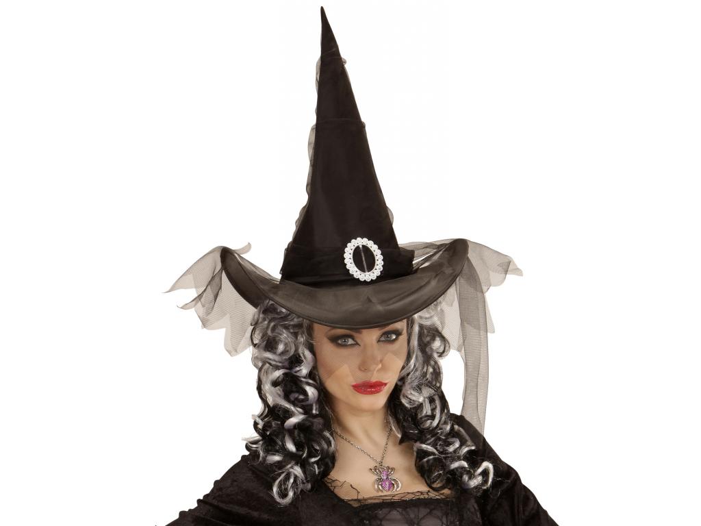 Felnőtt jelmezkiegészítő: fekete színű csúcsos kalap, a kalapszalagon medállal, illetve a kalaphoz rögzített tüll fátyollal. Ideális kiegészítő boszorkány jelmezekhez. Egységes felnőtt méret. A termék csak jelmezkiegészítő kellék, tehát a képeken látható további jelmezeket, egyéb kiegészítőket kellékeket nem tartalmazza!