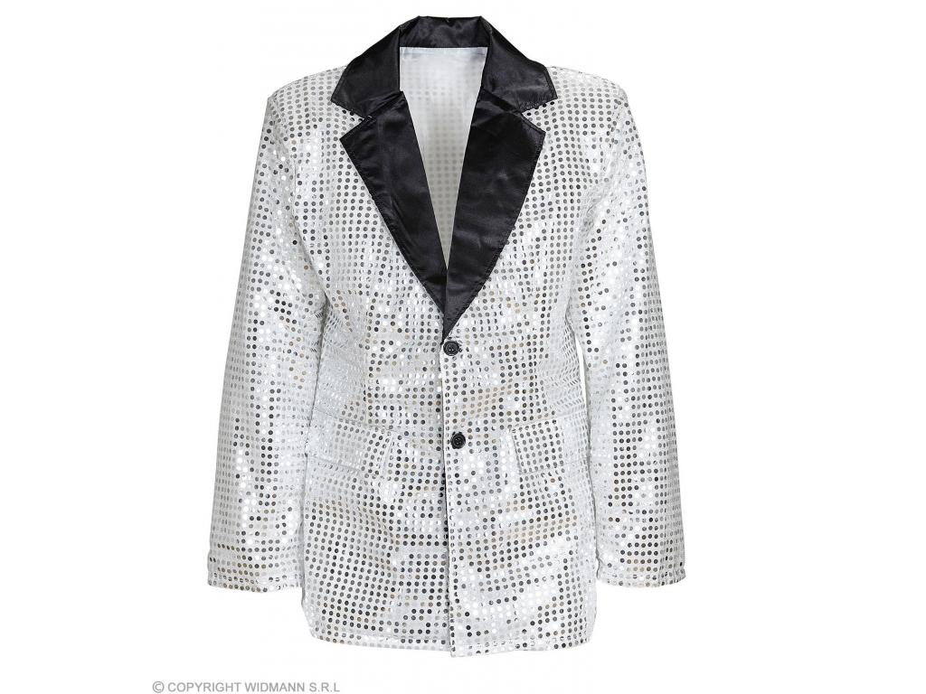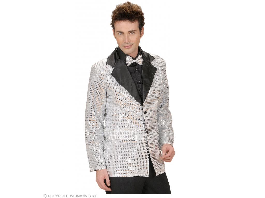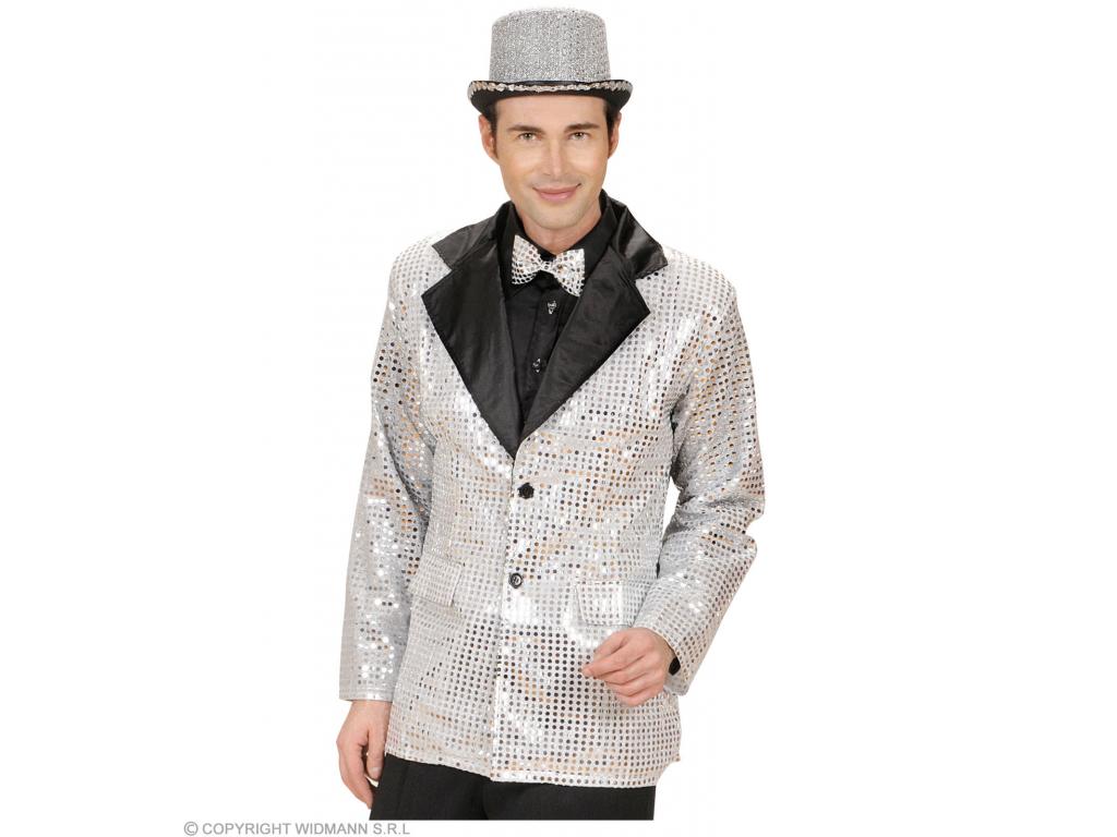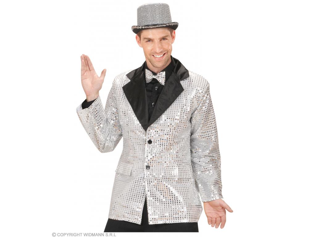 Csillogó flitterekkel díszített ezüstszínű zakó, fekete bársony hajtókával. Felnőtt jelmezkiegészítő (csak zakó), a képen látható többi jelmezt és kiegészítőt nem tartalmazza a termék.