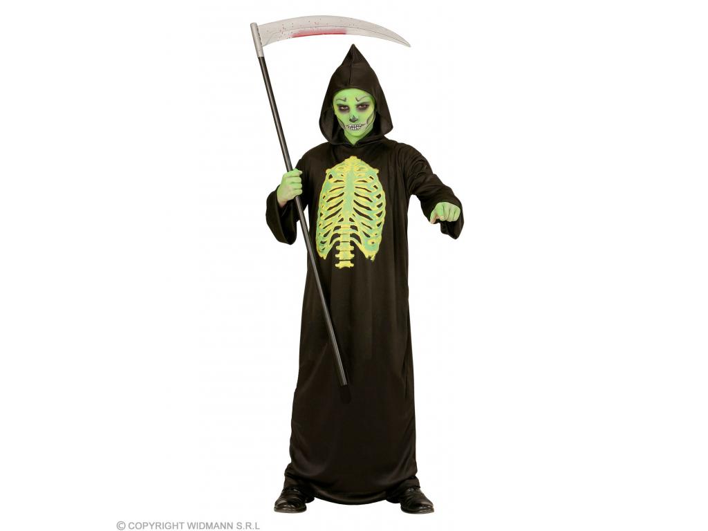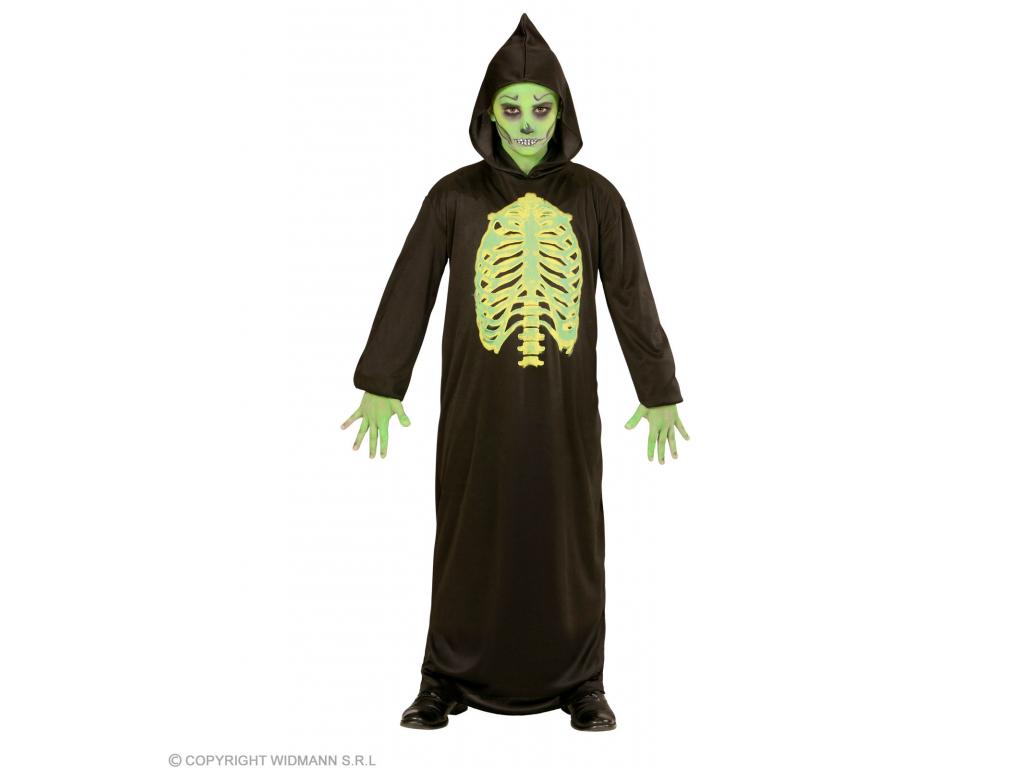 Gyermek jelmez: fekete színű, hosszú, kapucnis tunika, az elején neonzöld/neonsárga színű csontváz mintázattal. Az ár csak a talárra vonatkozik, a képeken látható további ruhadarabok, kiegészítők (pl. kasza vagy maszk) nem részei a terméknek. Félelmetes megjelenésű halloween jelmez, melyet néhány további kiegészítővel és kellékkel még rémisztőbbé tehetsz: pl. megfelelő sminkelés vagy maszk, kasza, stb. További halloween témájú kiegészítőket, kellékeket, sminket és maszkokat áruházunkban széles választékban találhatsz.