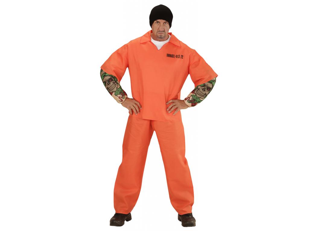 Felnőtt jelmez. Részei: narancssárga nadrág és felsőrész, tetovált izompárnázott karokkal. A jelmez cipőt, bilincset, béklyót, láncot, sapkát nem tartalmaz. Ebben a jelmezben egy pillanat alatt tetovált, izmos börtönlakóvá változhatsz - a jelmezbál idejére. További kiegészítőkkel még fokozhatod a hatást (bilincs, lánc, béklyó, stb.) ezeket megtalálod áruházunkban is.