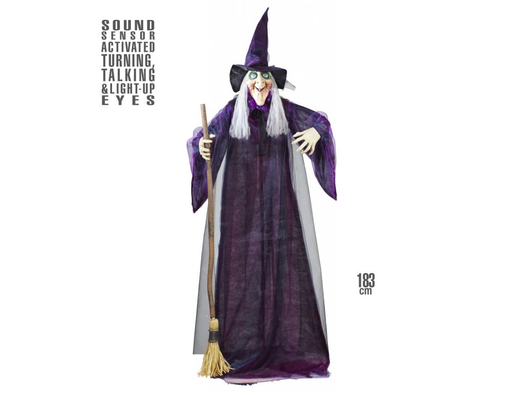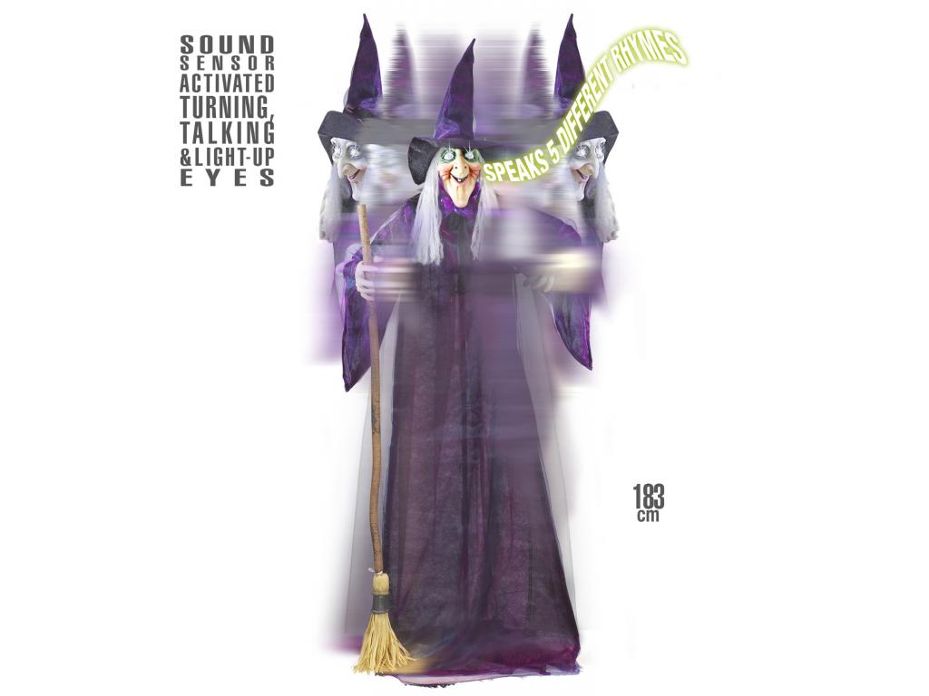 Halloween vagy más hasonló, tematikus rendezvények hatásos dekorációs kelléke lehet ez az életnagyságú, hang-és fényeffektes, animált boszorkányfigura. Magassága: 183 cm. Hangérzékelős aktiválással kapcsolódnak be az effektek: a figura ide-oda forog, világítanak a szemei, miközben 5 féle különböző mondatot is beszél. A szenzoros aktiváció mellett lehetőség van gombnyomásra "Try Me" funkcióval bekapcsolni az effekteket.