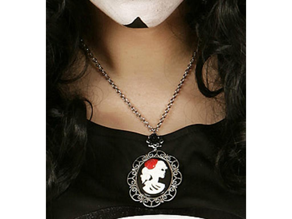 Halloween, boszorkány, vámpír, zombi, gothic és más hasonló témájú jelmezünket egészíthetjük ki különleges és egyedi módon ezzel a nyaklánccal, melyen vörös és fekete rózsákkal díszített cameo koponyás medál függ.