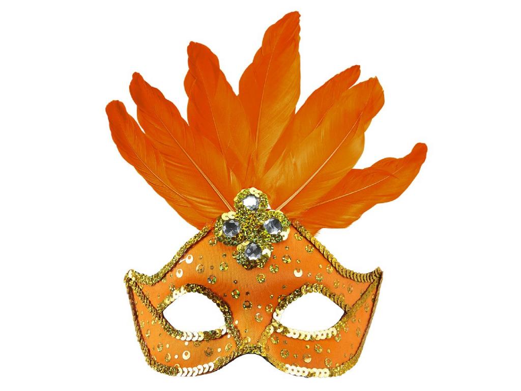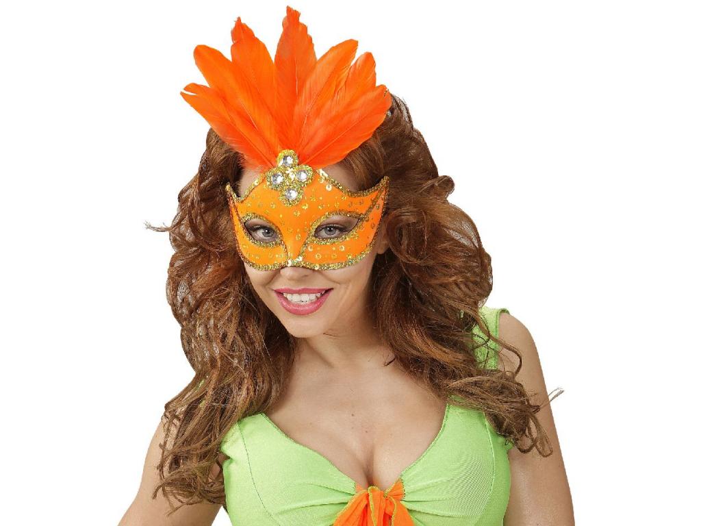 Neon-narancssárga brazil karneváli szemmaszk, flitterekkel, és tolldísszel