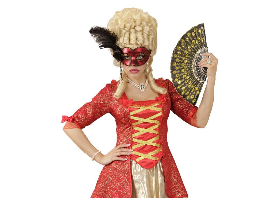 Karneváli jelmezek fénypontja lehet ez a gyönyörű velencei szemmaszk: fényes, piros színű maszk, fekete szegéllyel, valamint fekete színű gyöngysorokkal, rózsával és toll dekorációval. Egységes felnőtt méret. Az ár csak a maszkra vonatkozik, a képeken látható egyéb ruhadarabok, jelmezek és kiegészítők nem részei a terméknek.