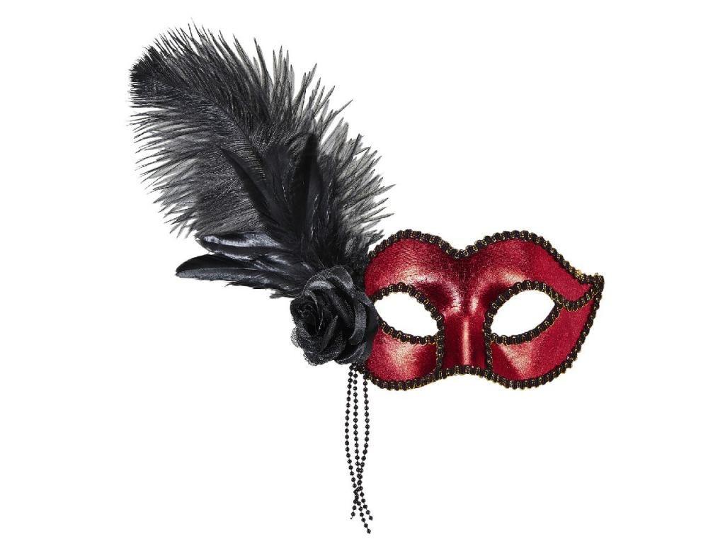 A Fémesen csillogó piros velencei szemmaszk, fekete rózsa és toll dísszel leírása: