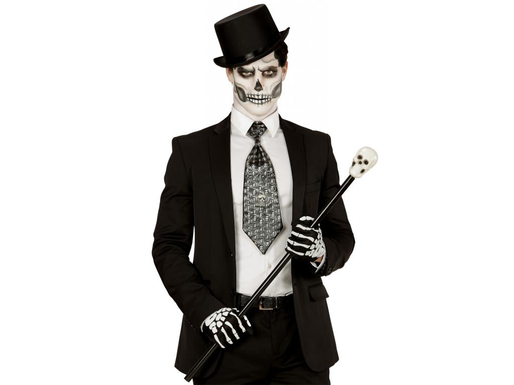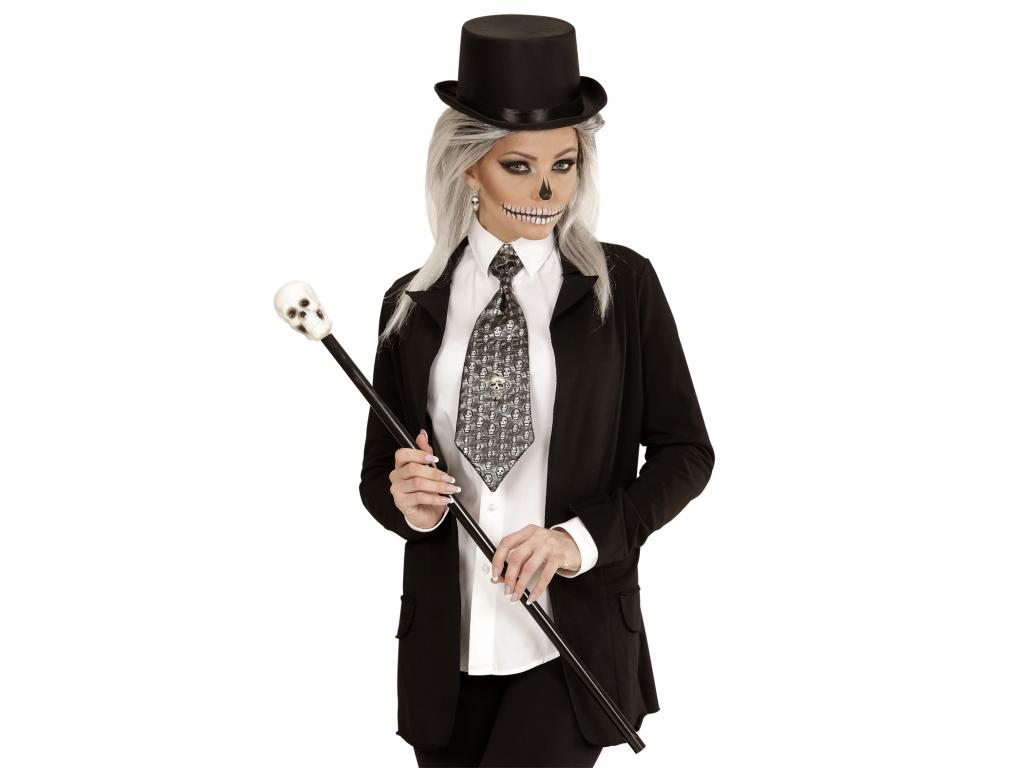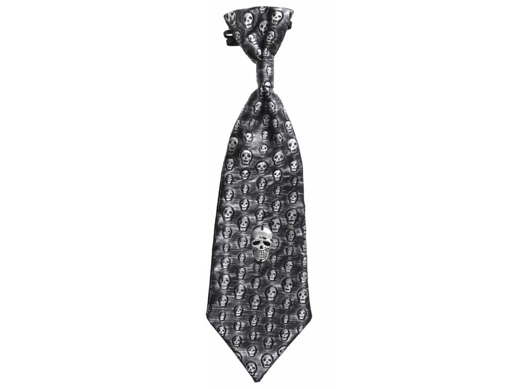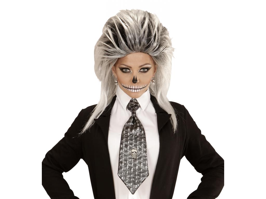 Halloween, boszorkány, vámpír, zombi, gothic és más hasonló témájú jelmezünket egészíthetjük ki különleges és egyedi módon ezzel a szürke/sötétszürke, fémes hatású, koponya-mintával díszített nyakkendővel. Az ár csak a nyakkendőre vonatkozik, a többi, képen látható ruhadarab és kiegészítő nem részei a terméknek.