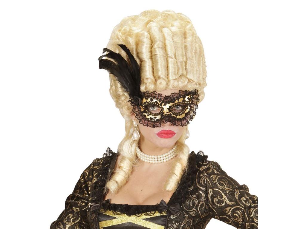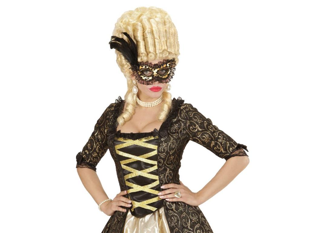 Karneváli jelmezek fénypontja lehet ez a gyönyörű velencei szemmaszk: fényes, bársonyos felületű, aranyszínű maszk, fekete csipkés díszszegéllyel, valamint fekete rózsával és tolldísszel. Egységes felnőtt méret. Az ár csak a maszkra vonatkozik, a képeken látható egyéb ruhadarabok, jelmezek és kiegészítők nem részei a terméknek.