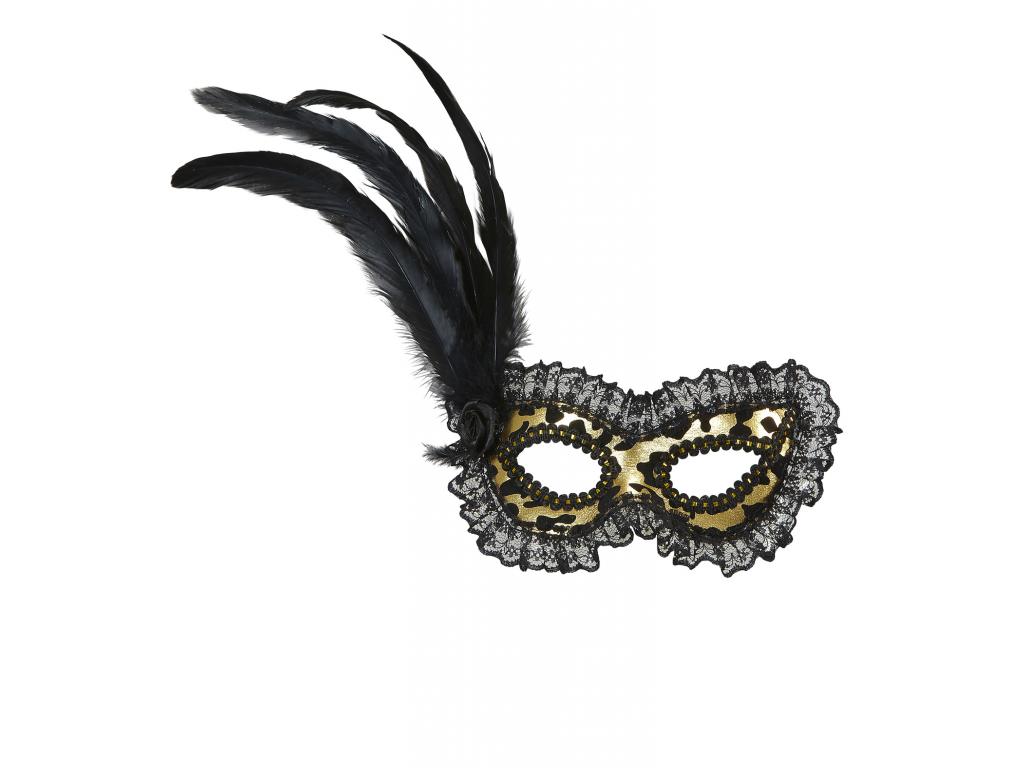 A Aranyszínű szemmaszk, fekete csipkeszegéllyel és tollal leírása: