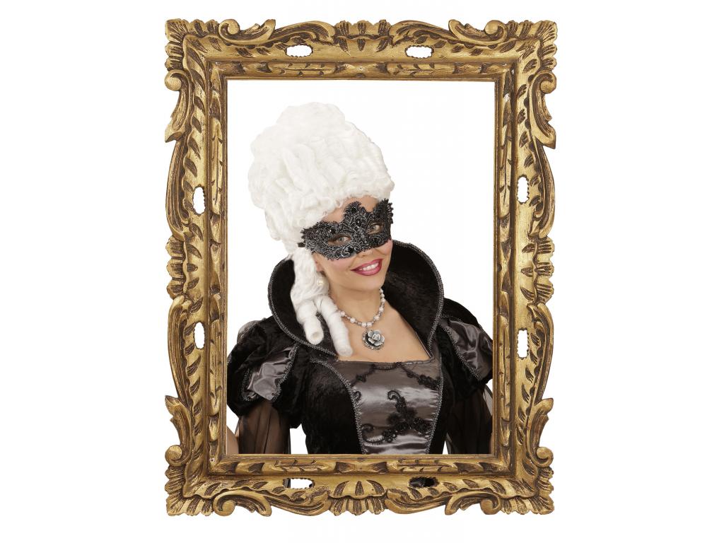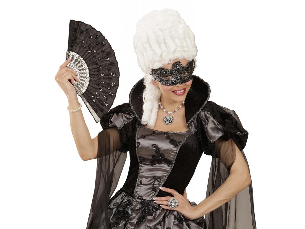 Gazdagon díszített velencei szemmaszk: antikolt hatású, sötét ezüstszínű, csillámló, csipkés szemmaszk, ékkövekkel díszítve. Egységes felnőtt méret. Az ár csak a maszkra vonatkozik, a képeken látható egyéb ruhadarabok, jelmezek és kiegészítők nem részei a terméknek.
