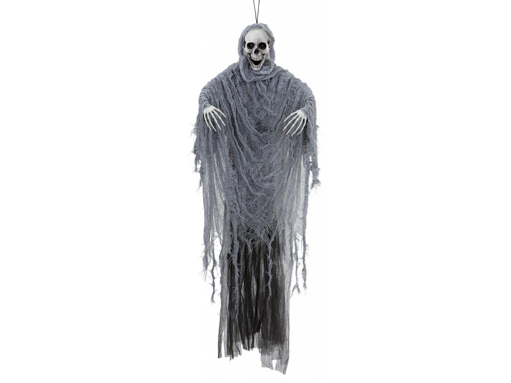 Halloween vagy más hasonló, tematikus rendezvények hátborzongató dekorációs kelléke lehet ez a félelmetes, hang-és fényeffektes, animált Grim Reaper csontvázfigura. Magassága: 100 cm. Hangérzékelős aktiválással kapcsolódnak be az effektek: a figura ide-oda forgatja a fejét, világítanak a szemei, miközben félelmetes nevető hangot ad ki. A szenzoros aktiváció mellett lehetőség van gombnyomásra "Try Me" funkcióval bekapcsolni az effekteket.