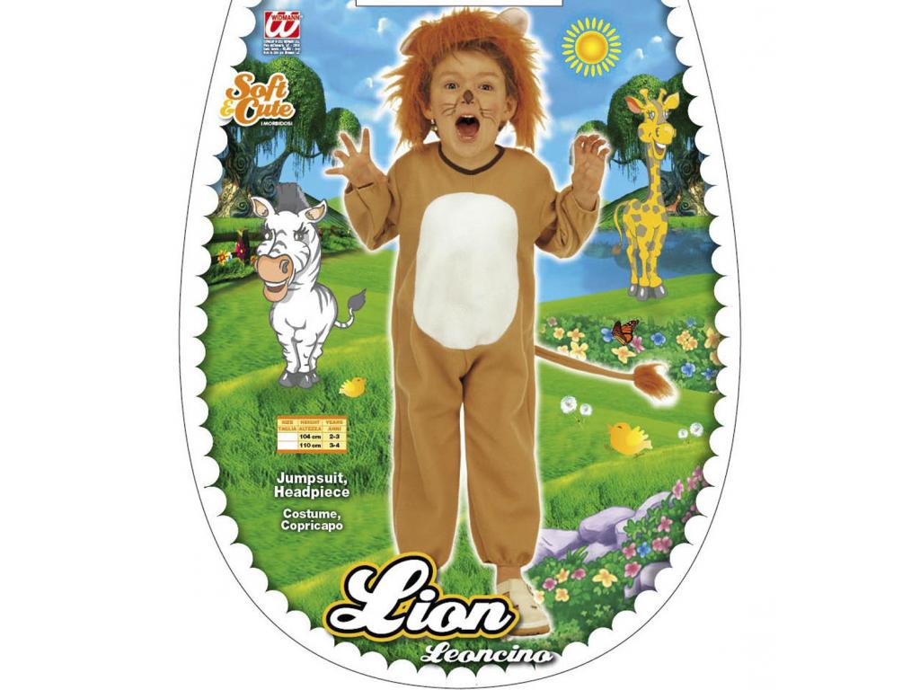 Gyermek jelmez: világosbarna-fehér színű kezeslábas overál jelmez, és külön feltehető sapka rész az oroszlán fejéhez. Kényelmes, puha overáljelmez, mely egy csapásra aranyos kölyök oroszlánná varázsol.