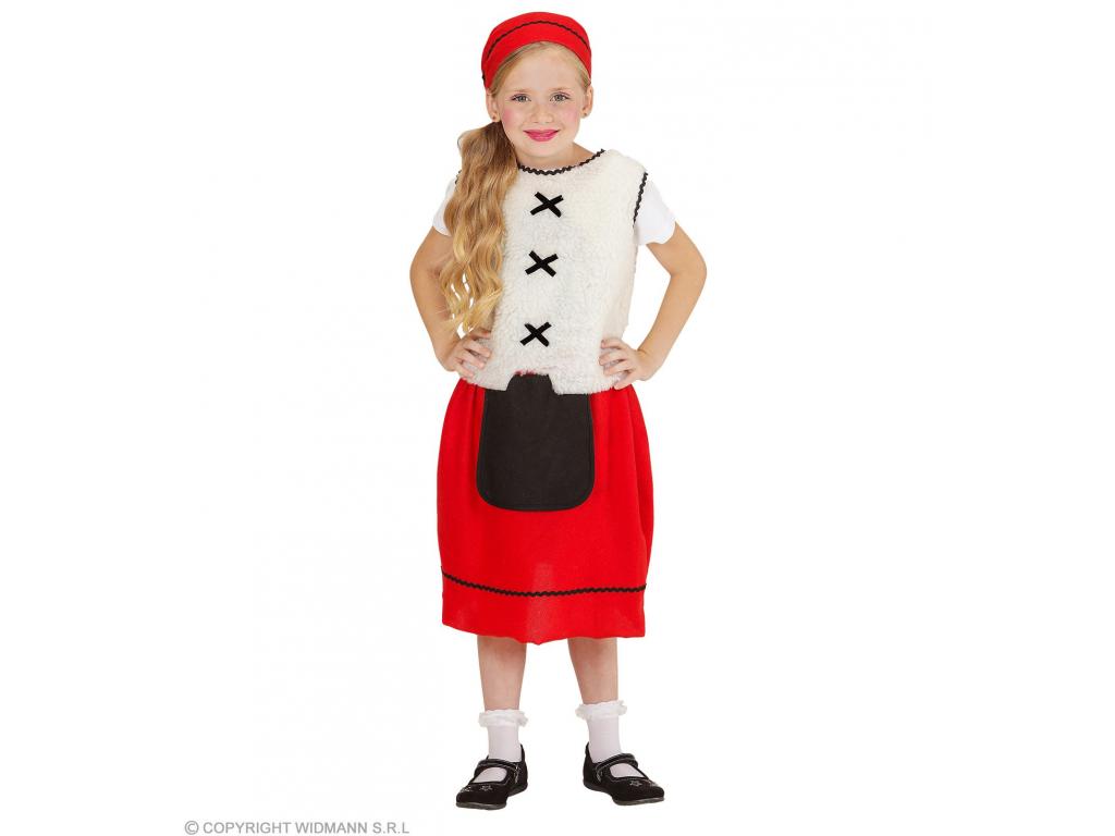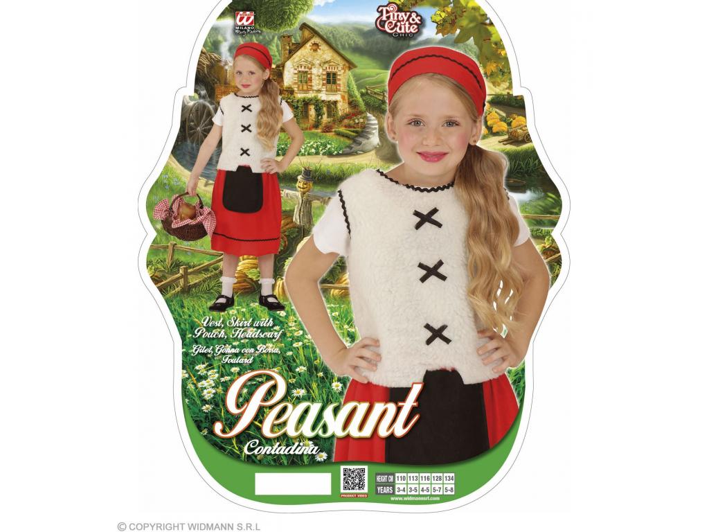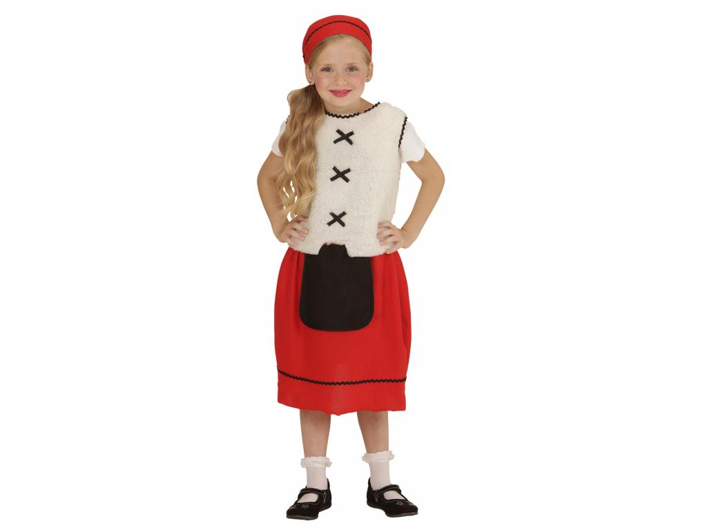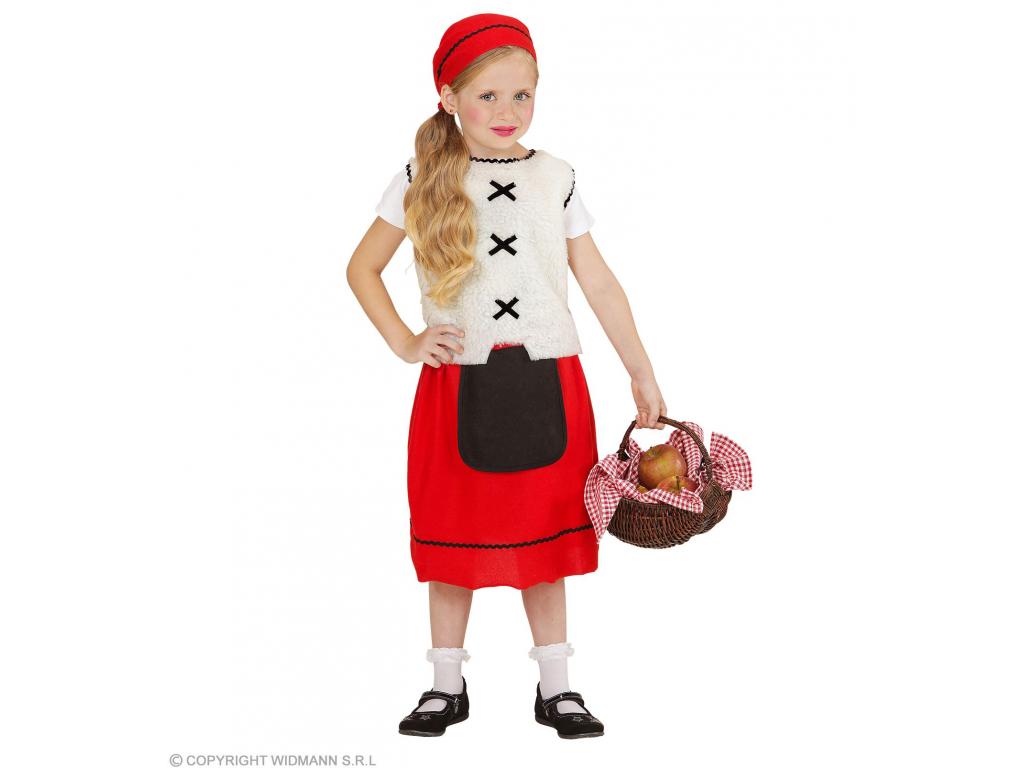 Gyermek jelmez szett: piros szoknya, elől fekete zsebbel, fehér színű, prémes hatású mellény, piros fejkendő/sapka. A kosár nem része a szettnek. Aranyos és eredeti jelmez farsangi bálba, vagy mese előadásokra.