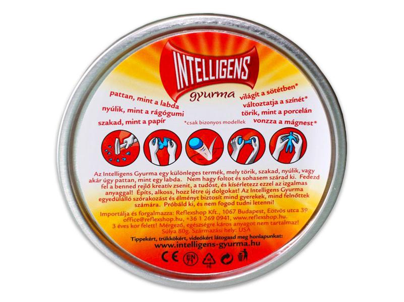 Neon színű gyurma. Az intelligens gyurma egy speciális anyagból készül. A második világháború során USA-ban fejlesztették ki. Finom mozdulatokkal használva is könnyedén formázható, nem hagy nyomot a kezünkön. Gömböt formálva visszapattan a felületről, nagy erőbehatásra széttörik kis darabokra. Nem szárad ki, hosszú távon használható. Mérete: 10 x 10 x 4 cm.
